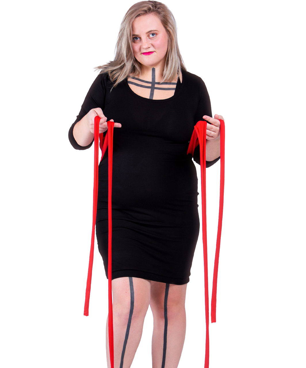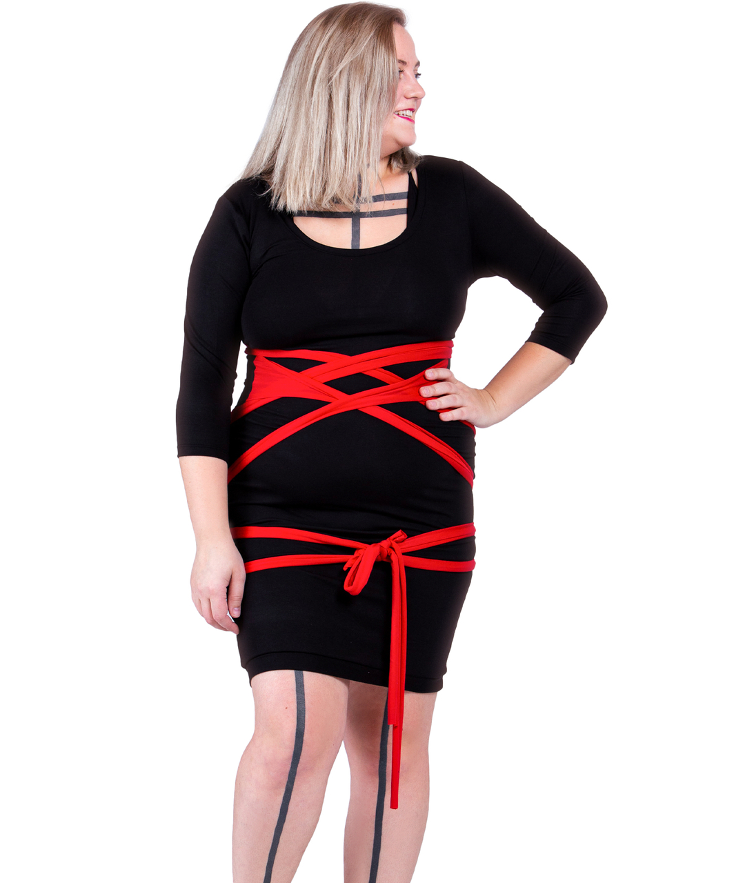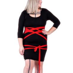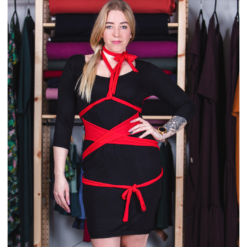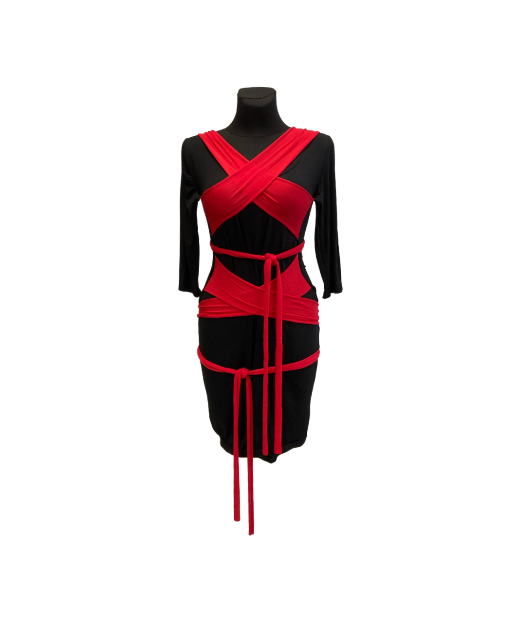 Black soft mini dress with sewn-in red sashes at either side. Made in Latvia.