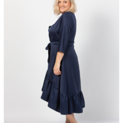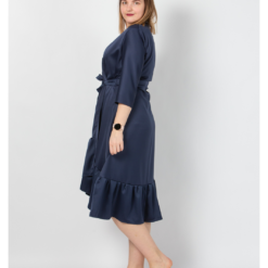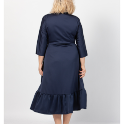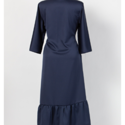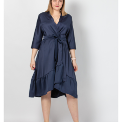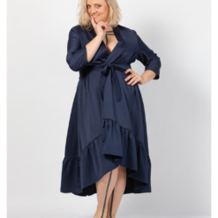 Dark blue, asymmetrical robe with a ruffle and a built-in belt on the sides. Made of silky and nice-to-touch fabric. The robe is easy to care. Made in Latvia.