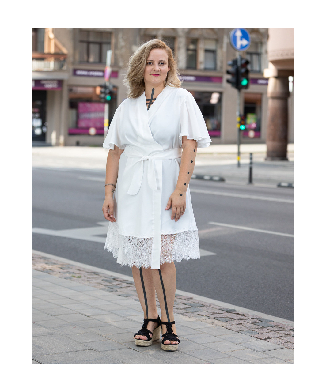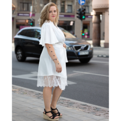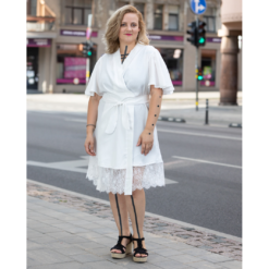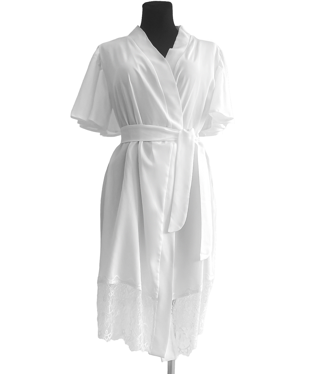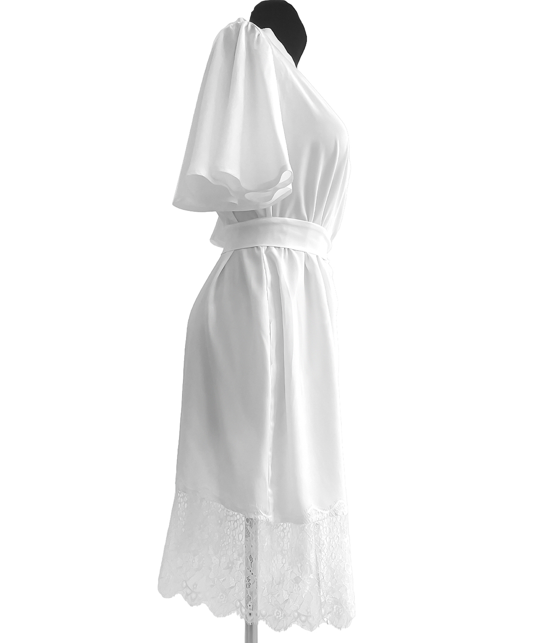 White robe with short flounce sleeves, lacy hem and sash.