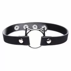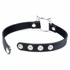 Leatherette choker with metal kitty ring. Adjustable press button closure.