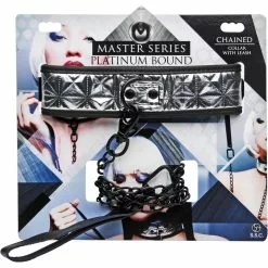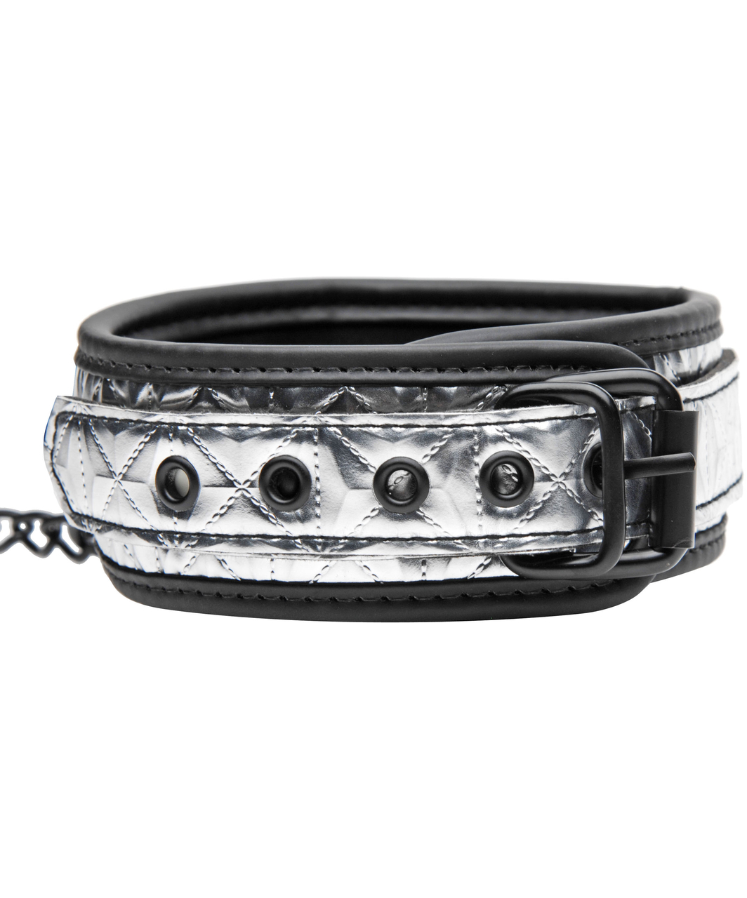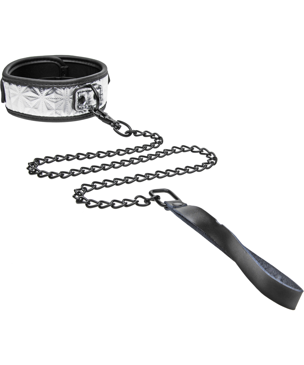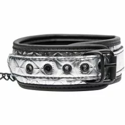 Neoprene collar with embossed silver patent leather finish with a black chain leash with faux leather loop.