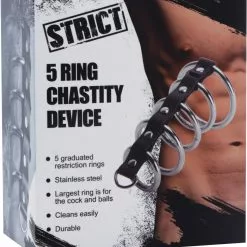 5 ring chastity cage made from differently sized metal rings connected with a faux leather strap. The larger ring is designed for the base while the smaller one goes around the head of the penis. Theres is a small ring at the end for a leash (not included).