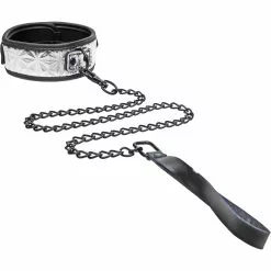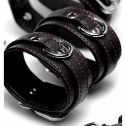 5 ring chastity cage made from differently sized metal rings connected with a faux leather strap. The larger ring is designed for the base while the smaller one goes around the head of the penis. Theres is a small ring at the end for a leash (not included).