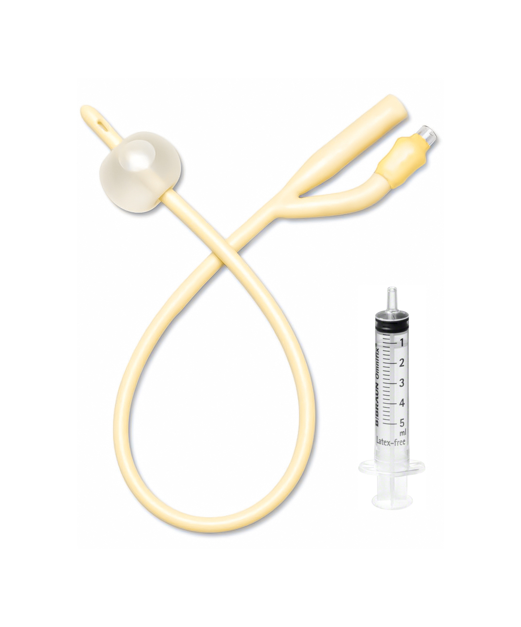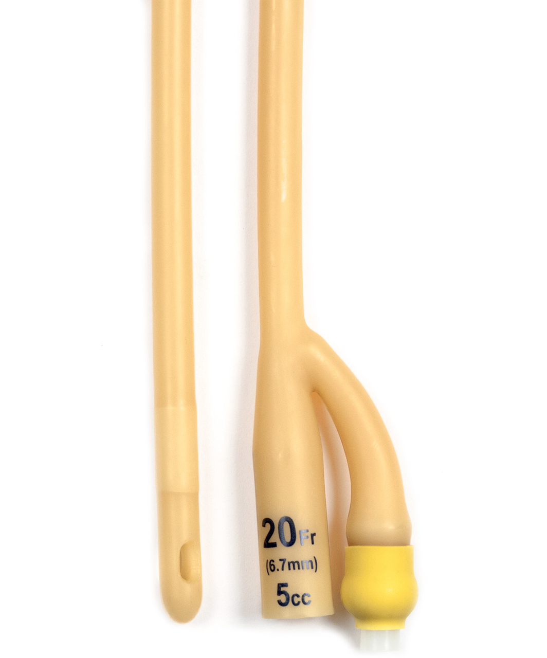 The Foley catheter has a rounded tip, one or two ‘eyes’ (holes through which the urine enters the main tube), and a tiny balloon that can be inflated once the catheter is in place. Before insertion the balloon is evident as just a slightly raised area near the tip of the catheter.