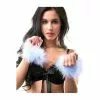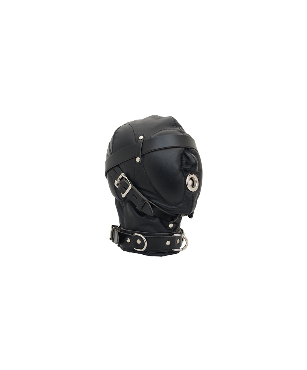 The Mister B Heavy Duty Hood has a laced closure on the back, under a zipped back panel to further tighten it. Two sturdy saddle leather straps and a collar, all of them lockable, add even more to the encased feeling. When you’re trapped into this dark leather world, even when your hands are free, you can’t take this hood off without unlocking the belts and the collar first. Locks are not included.