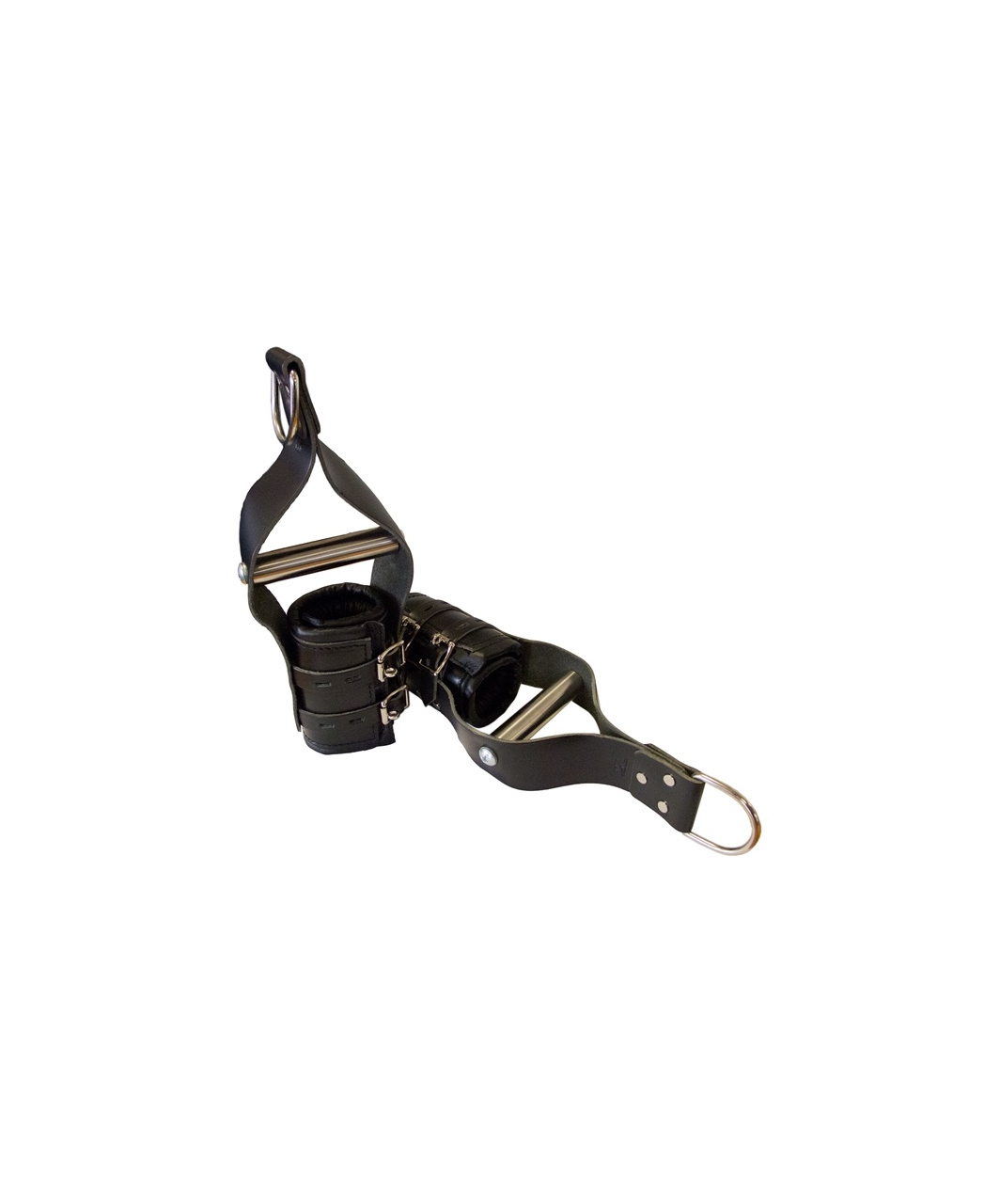 Mister B Premium Metal Bar Wrist Suspension Restraints Developed with perfection for (longer term) suspension in mind, these Mister B Premium Wrist Suspension Restraints are constructed of thick saddle leather and are lined with soft leather coated thick foam. The result is a pair of suspension restraints tough enough to do their job really well, without compromising the comfort factor which becomes so important when you’re being suspended. What makes these restraints different from lots of other wrist suspension restraints, is that it features a stainless steel bar to hold on to with your hands. This vastly increases the time you can spend hanging up there. One size really fits all (we made sure the padding is long enough). Genuine leather. All rivets are heavy duty / high performance. Padlockable.