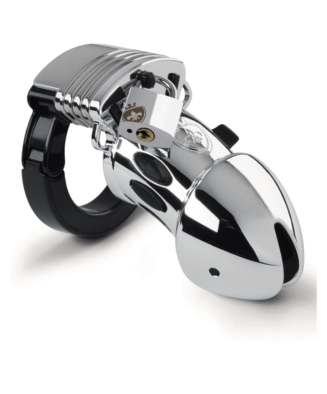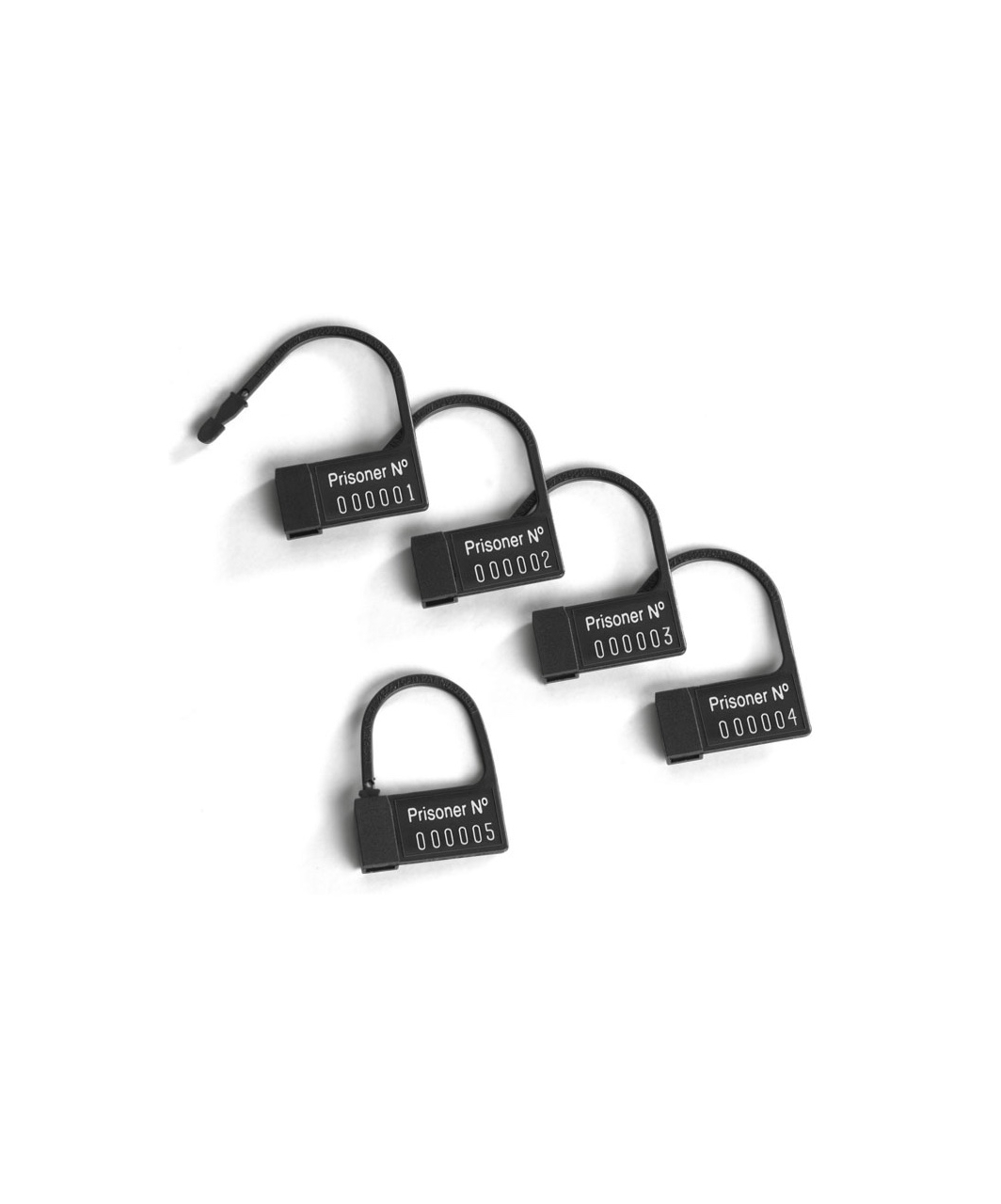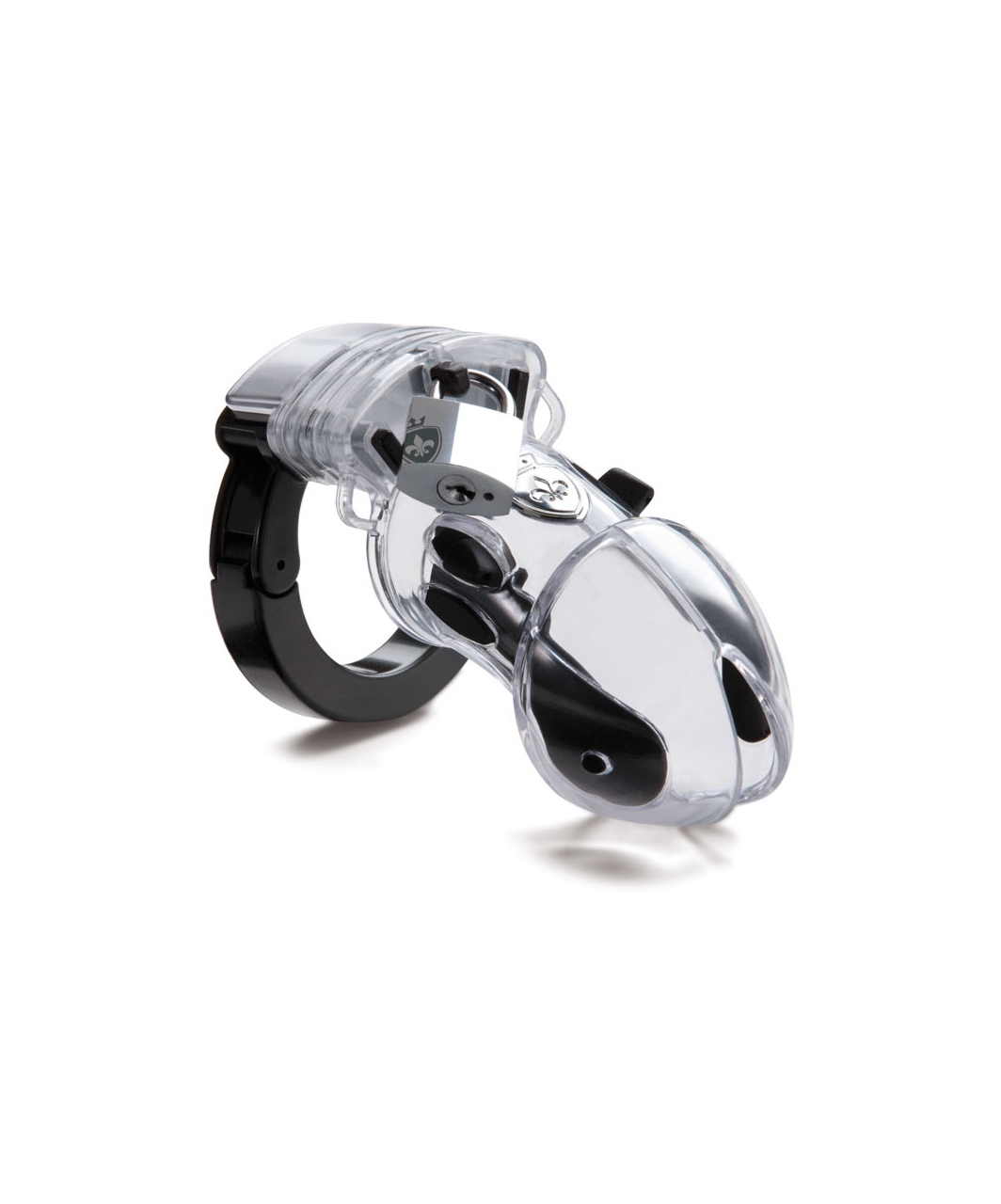 Transparent penis/testicle cage made out of solid silicone with a clamp, fixed disks, three distance pieces, a metal lock with two keys, 1 removable dilator, electrode cable, 5 plastic seals and ten possession signs. Material: silicone, ABS.