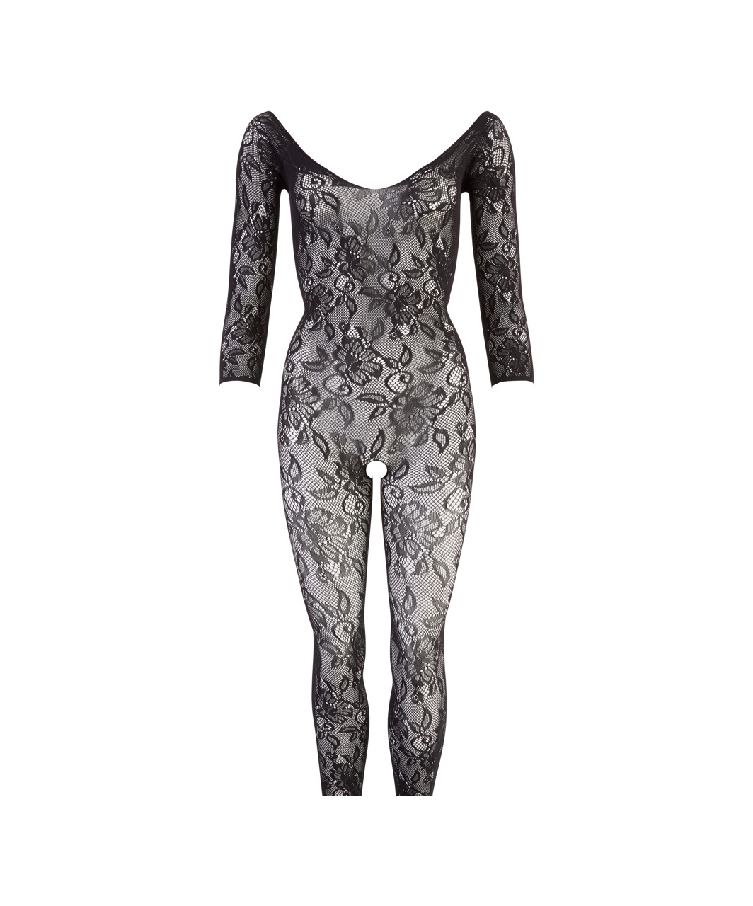 Seamless black sheer mesh bodystocking in a floral lace look. Crotshless, with open back and decorative lacing. Full-length, with 3/4 sleeves and foot part. Unisize (S–L).