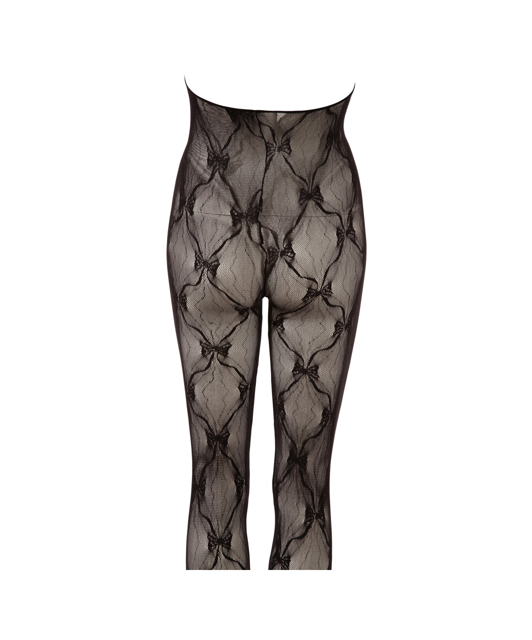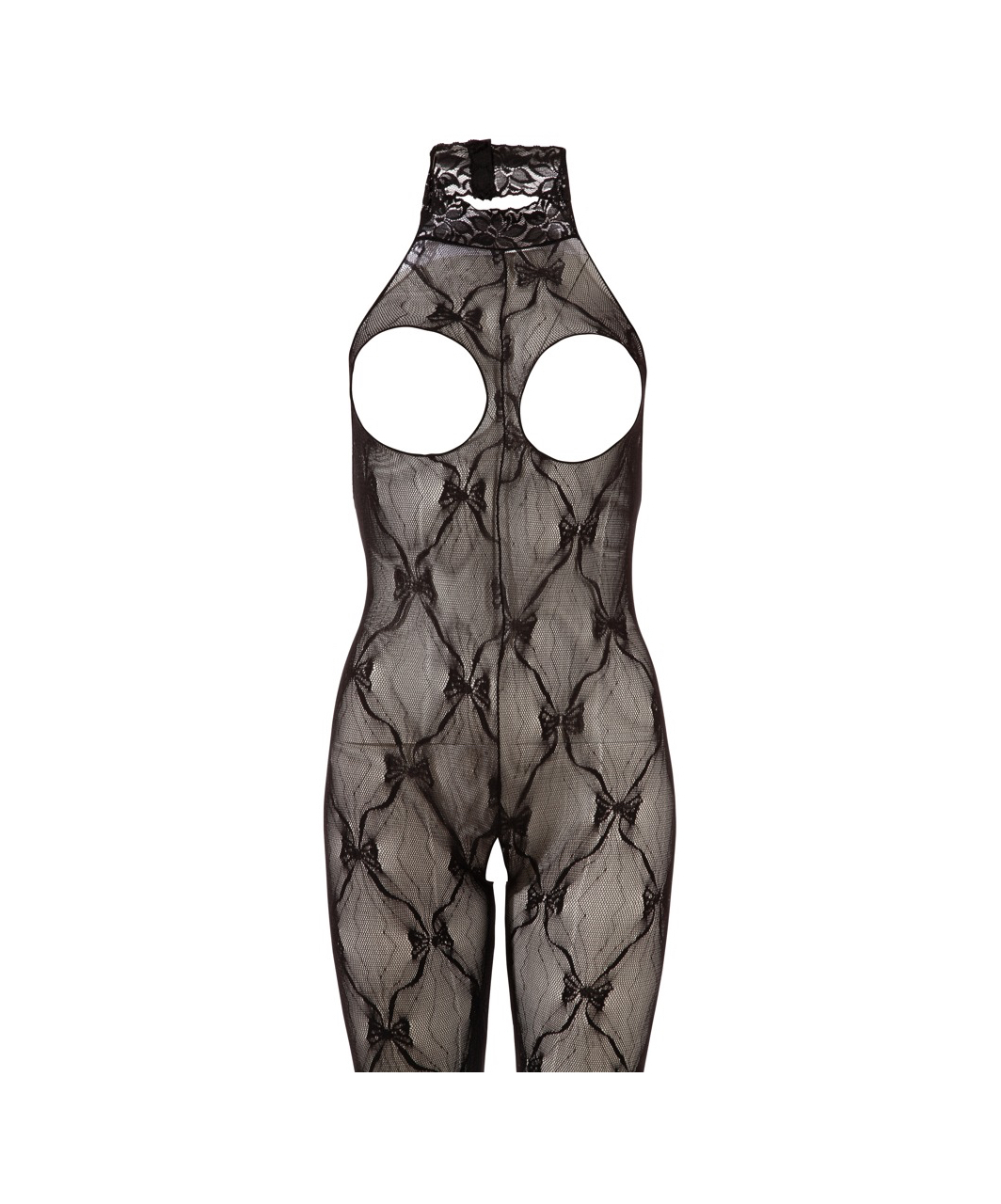 Black halterneck bodystocking. Crotchless, with open bust and back.