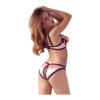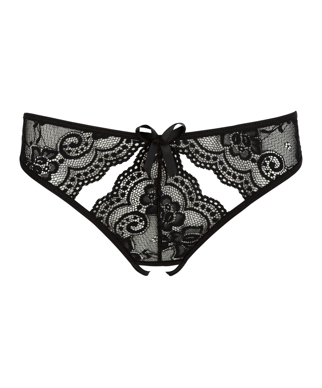 Black lace crotchless thong with cutouts and bows at the front and the back.