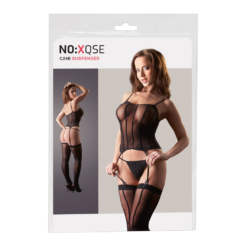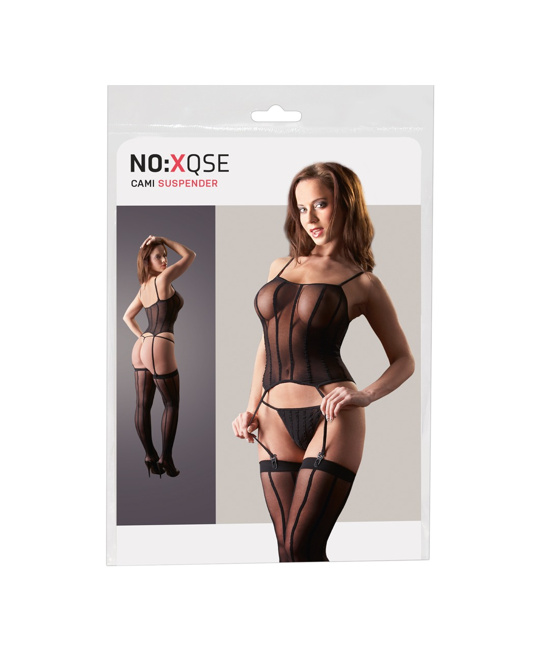 Sheer black basque, matching G-string and stockings with stripes. Unisize (S–L).