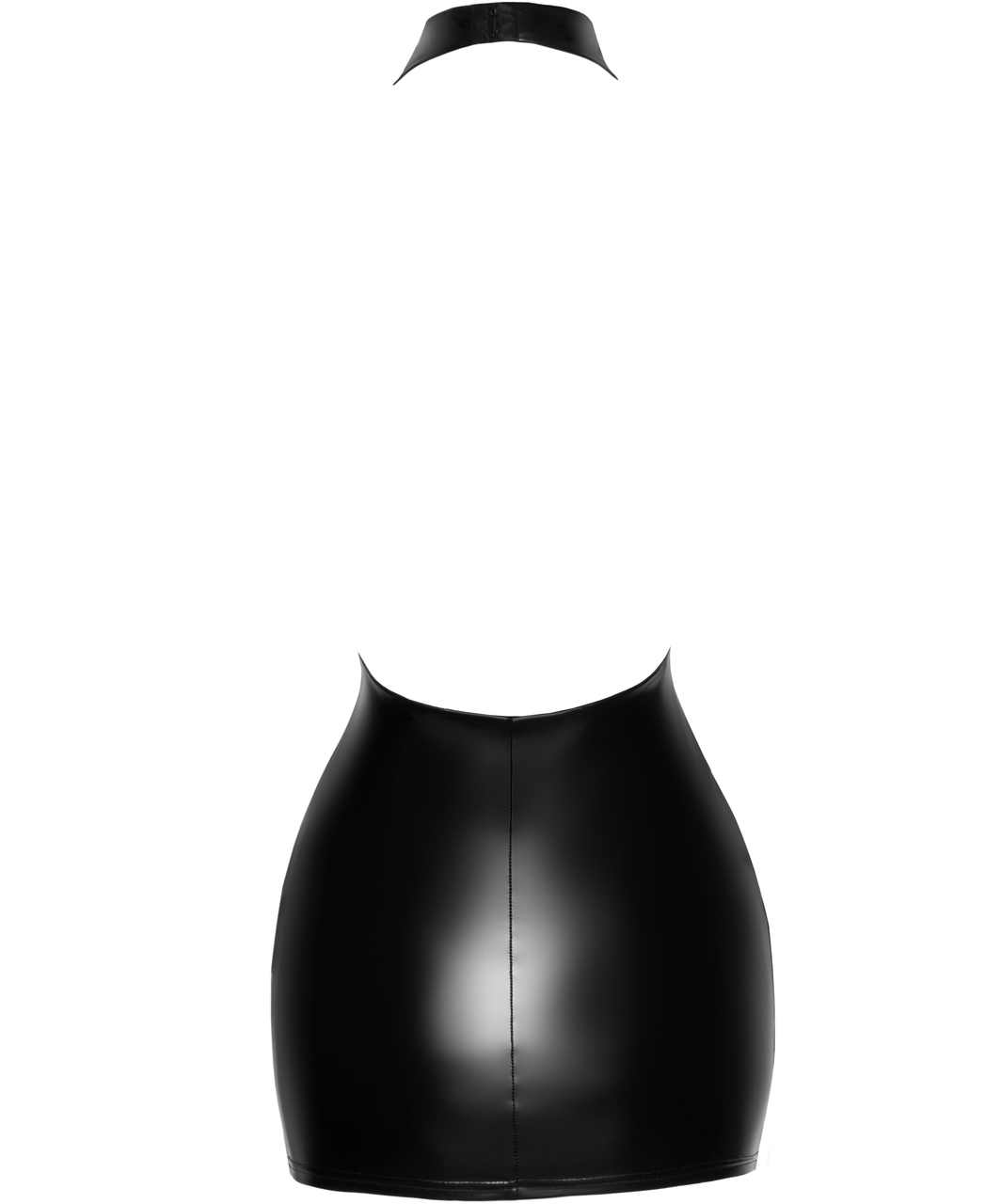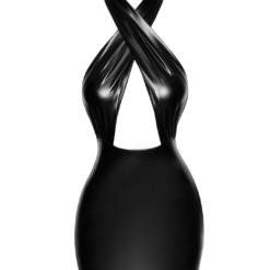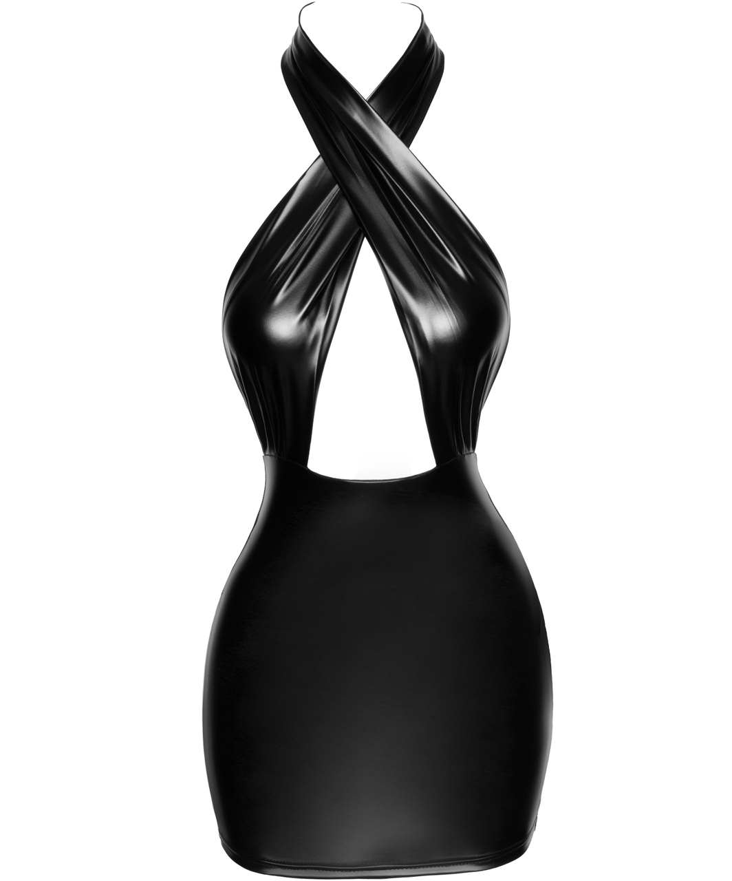 Black matte look mini dress with cross front and open back. Halter with hook closure.