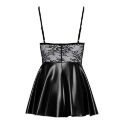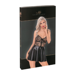 Black mini dress with a tight-fitting sheer lace bodice with underwire cups and front zipper. The flared skirt made of matte look fabric. Shoulder straps are adjustable.