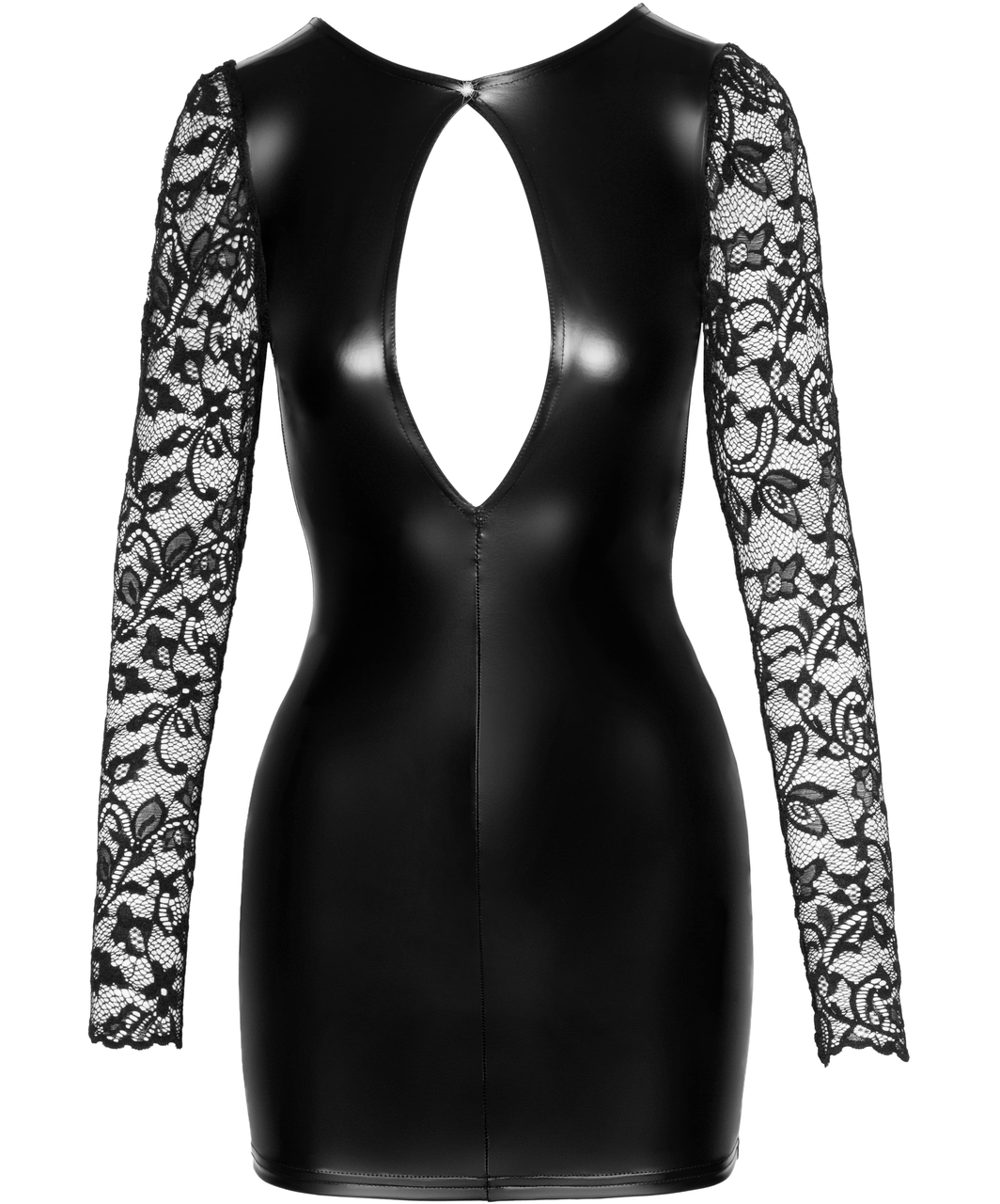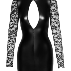Black matte look mini dress with front and back cutouts and long lace sleeves. Single front press stud is adorned with rhinestone.