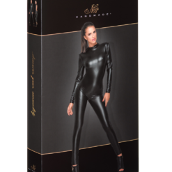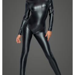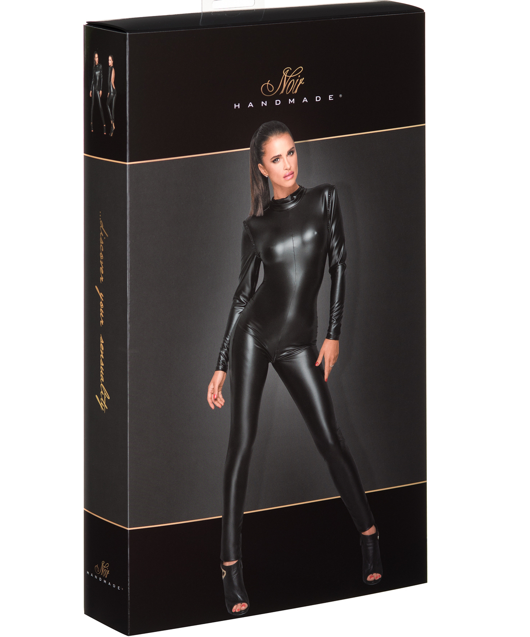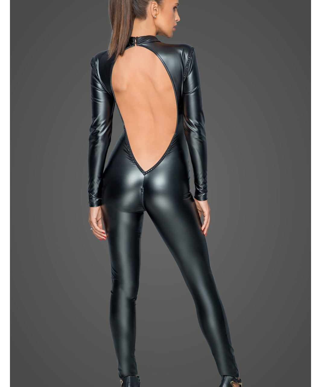 Tight-fitting black catsuit with long sleeves, shoulder pads and revealing cutout at the back. There is a crystal stone string on the lower edge of the cutout and around the seems at the top of the sleeves. Two way zipper over the crotch.