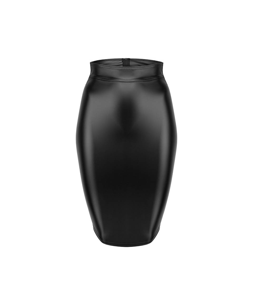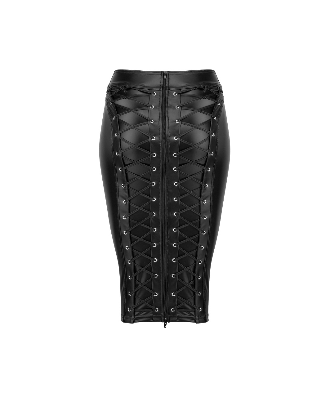 Black tight-fitting, matte look pencil skirt with lacing and zipper at the back.