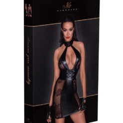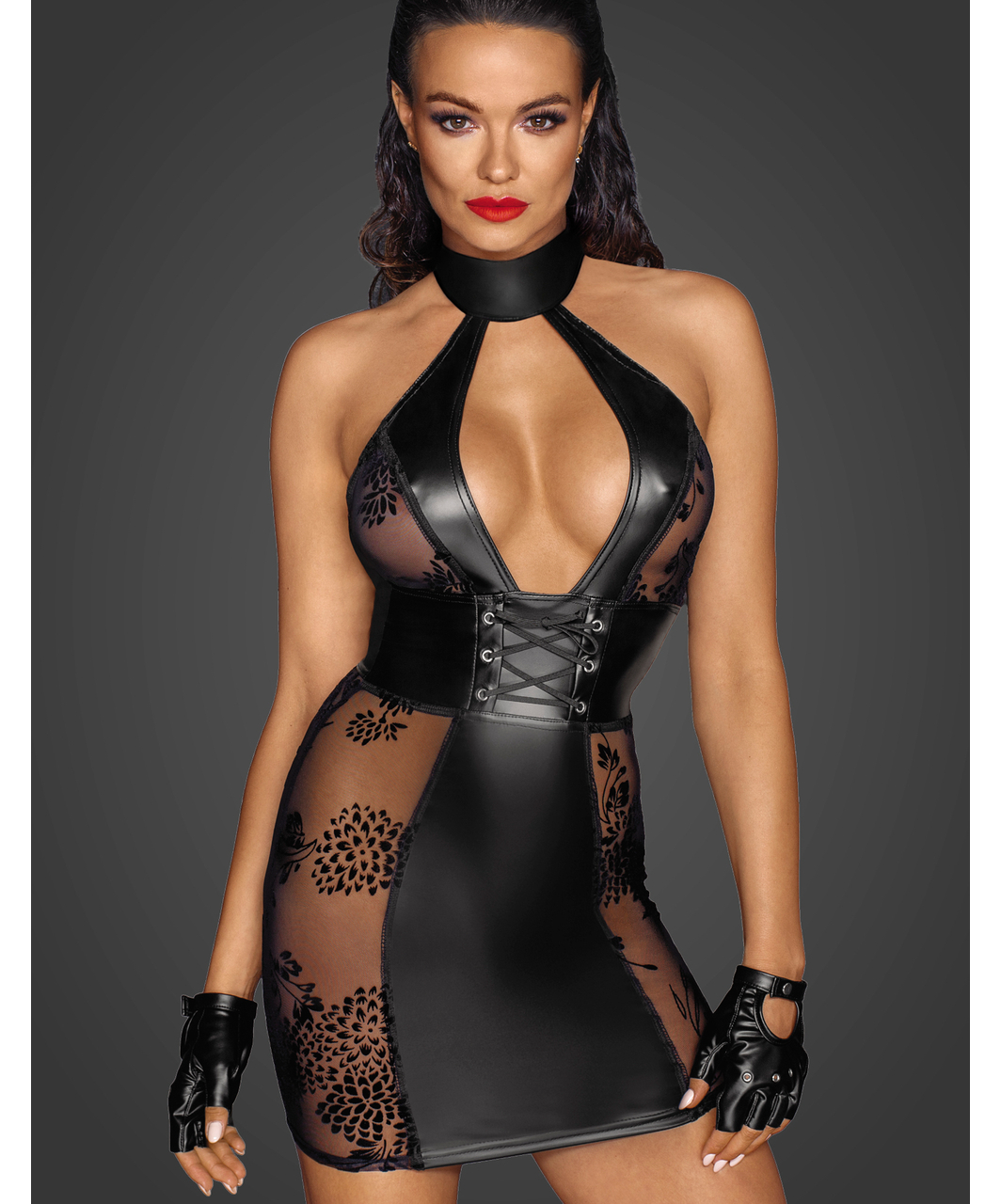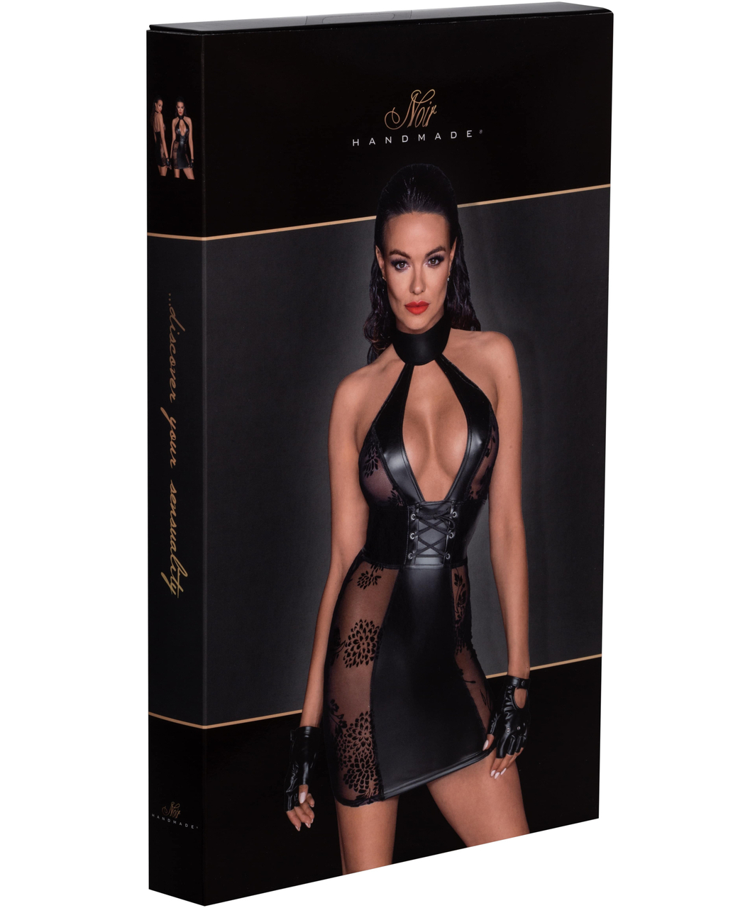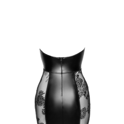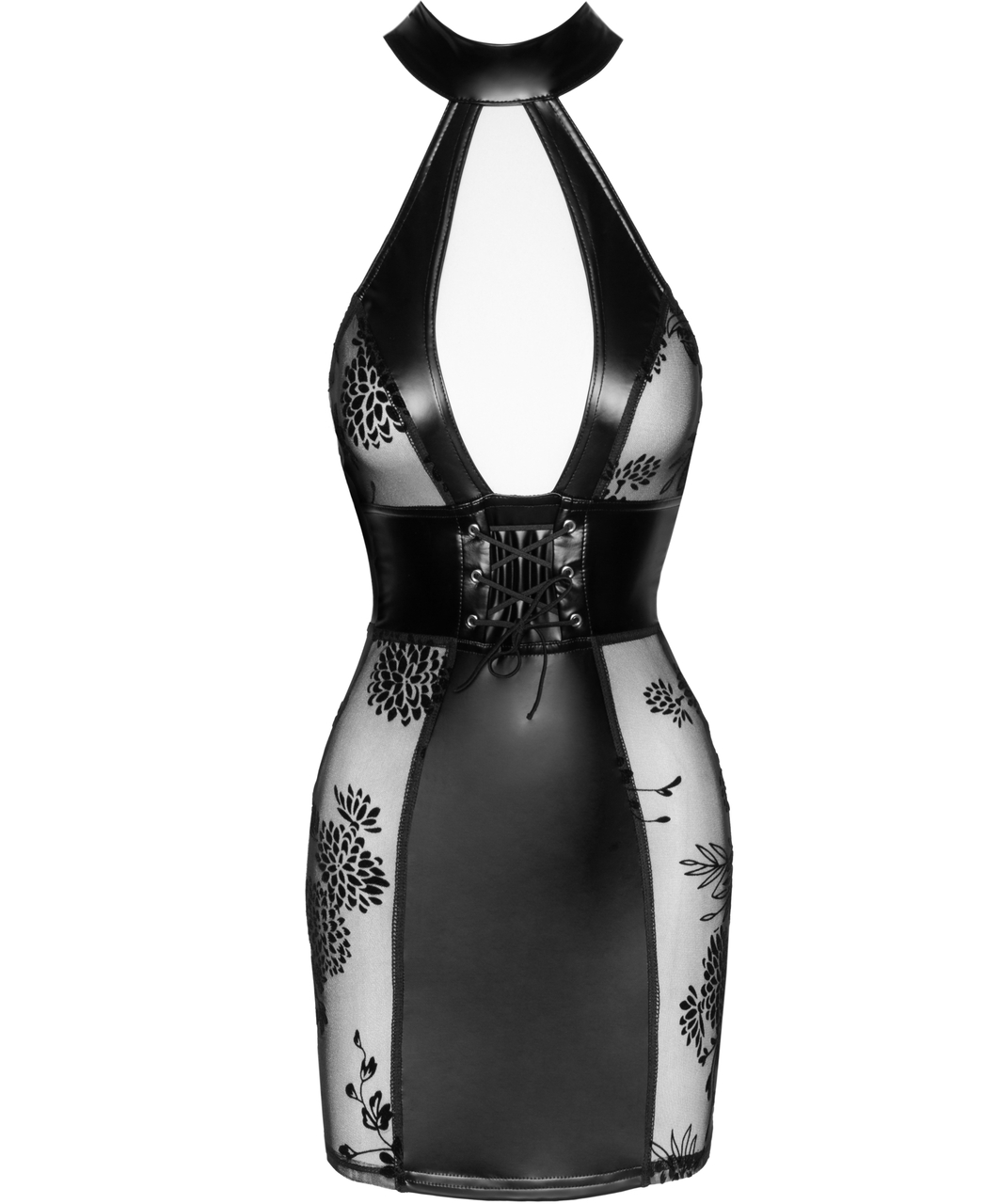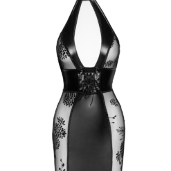 Black matte look mini dress with sheer mesh inserts and floral flock embroidery. The waist accentuated with corset binding. Hook closure and zipper on the back.