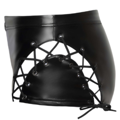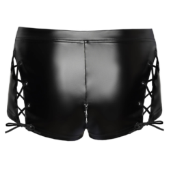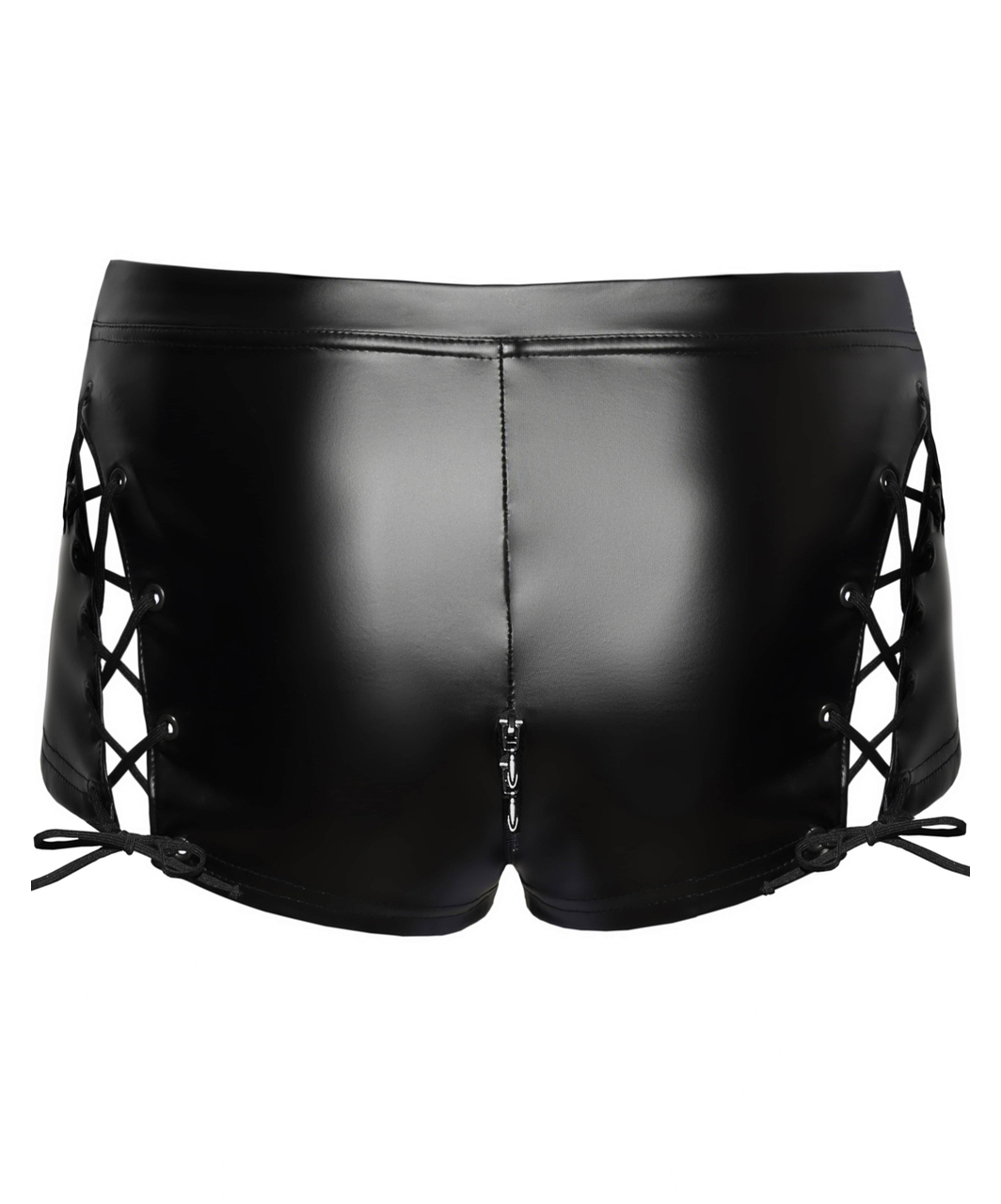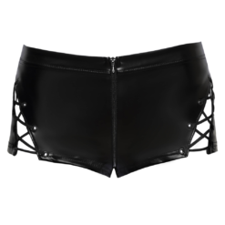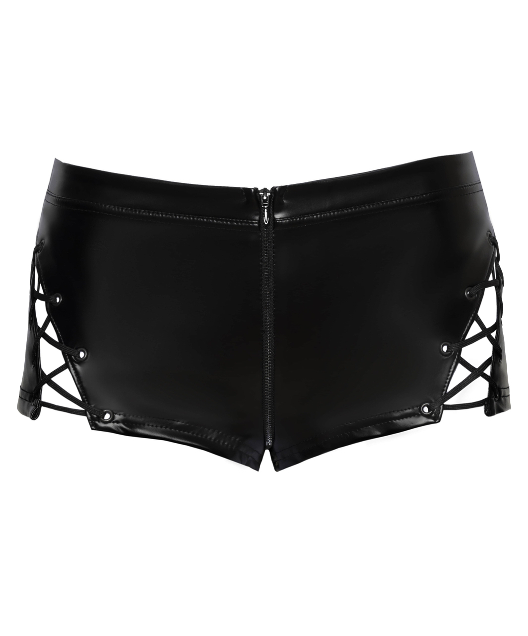 Black matte look shorts with lacing at either side and full-length two-way zipper over the crotch.