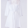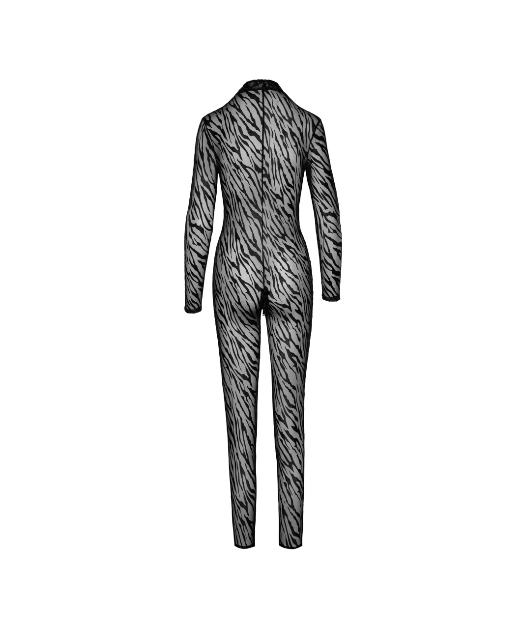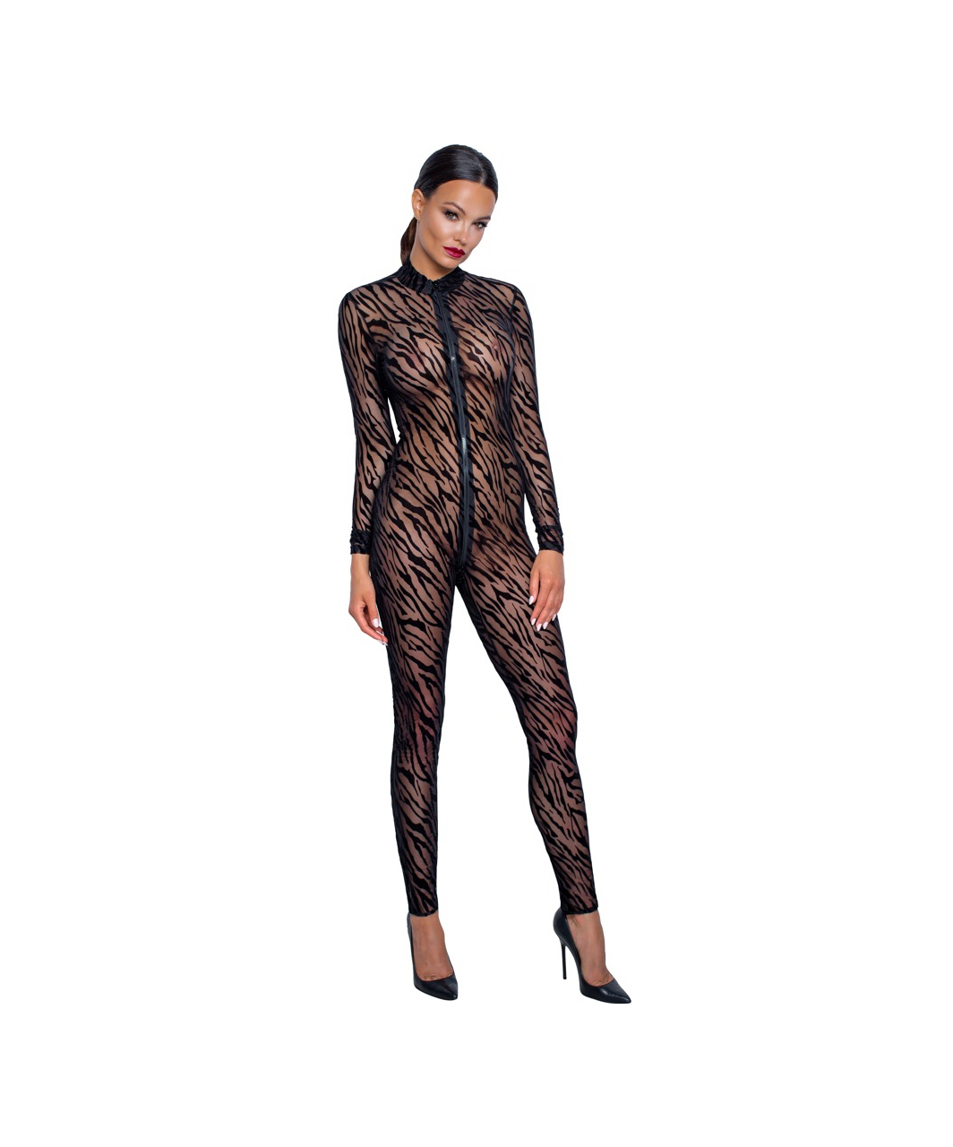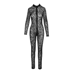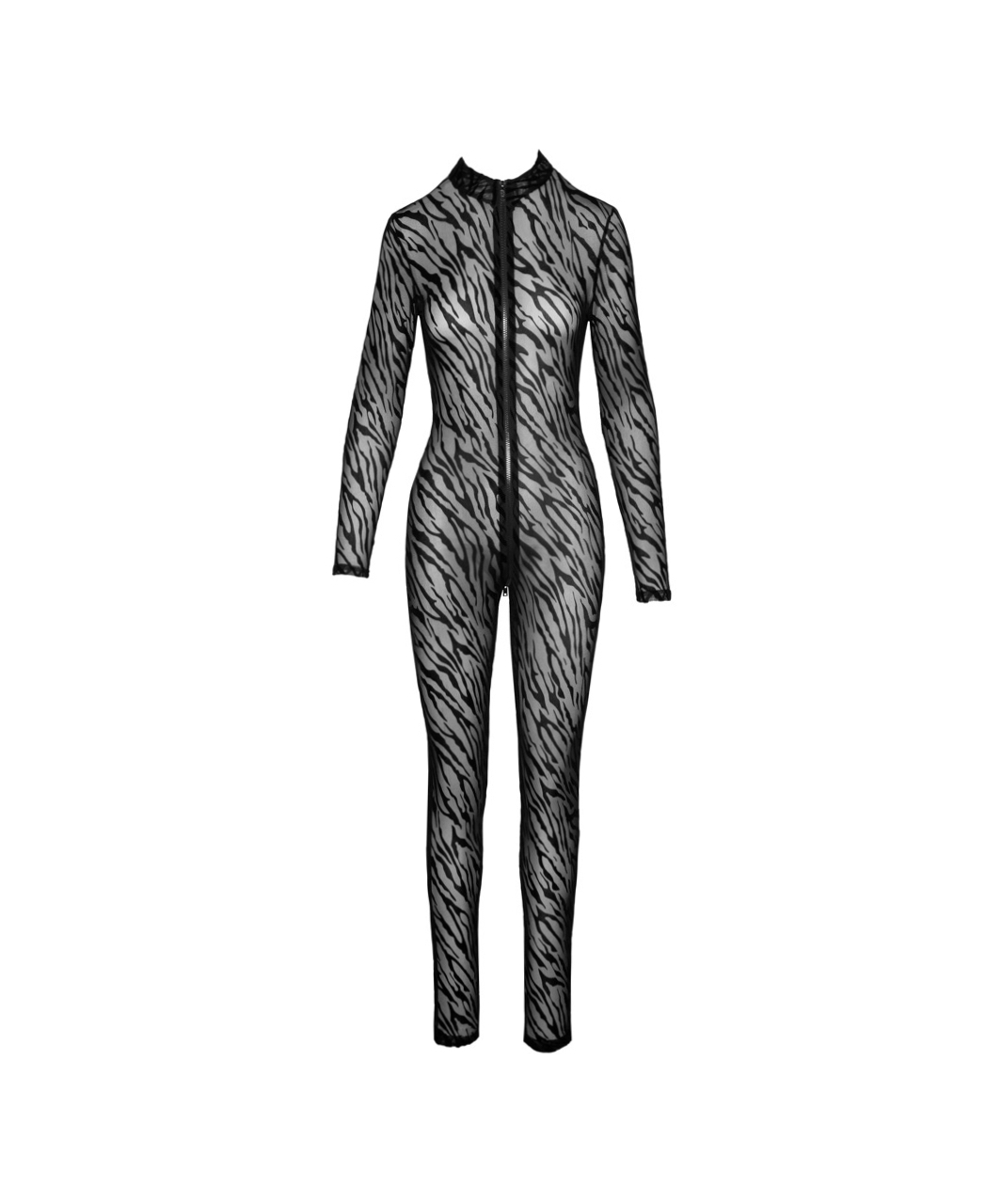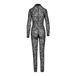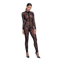 Black sheer mesh catsuit with long sleeves, flock print in a tiger stripes pattern and two-way front zipper with three sliders.