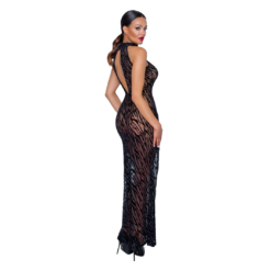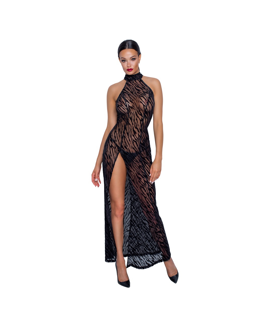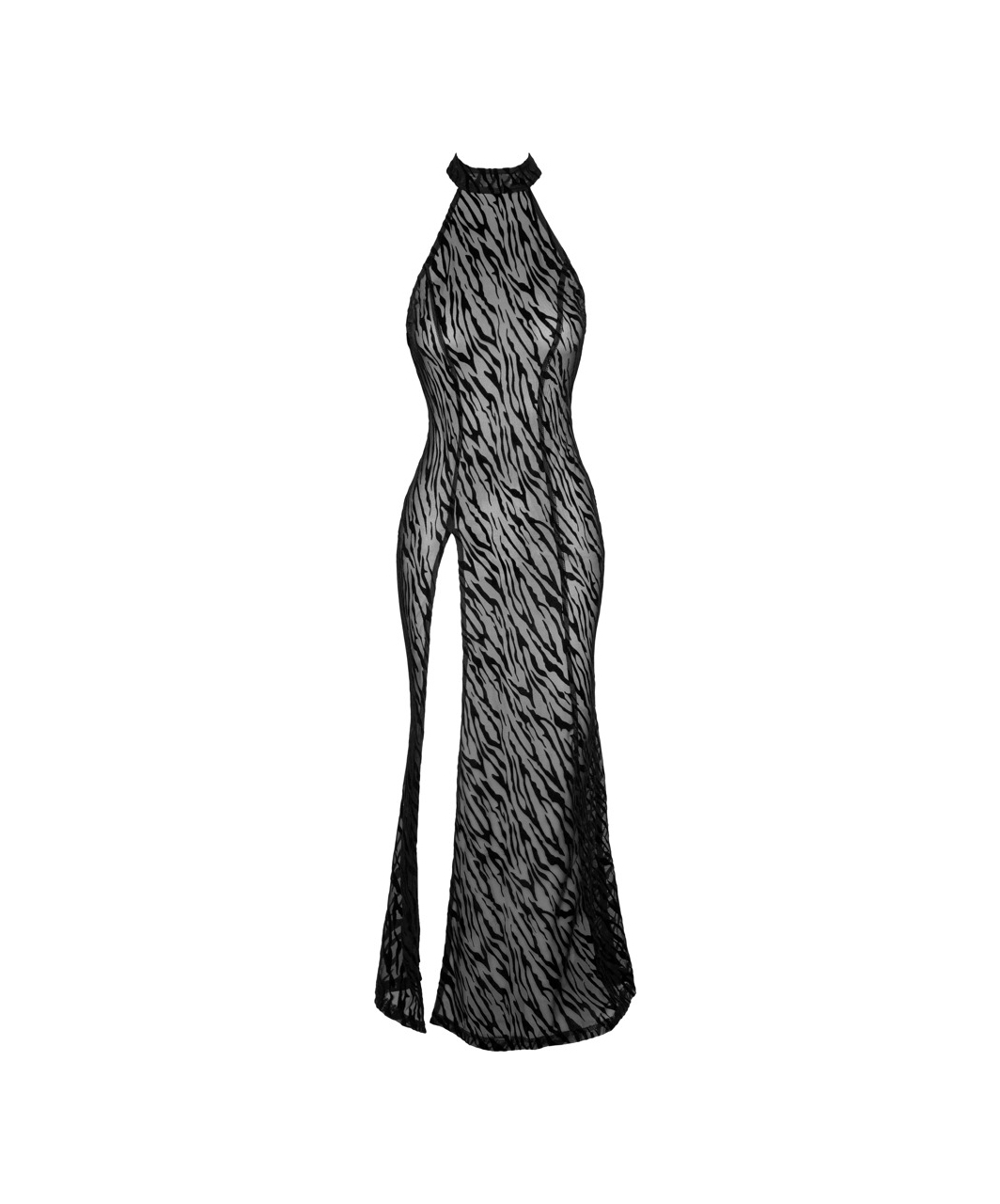 Sleeveless maxi dress made of soft sheer mesh with flock print in a tiger stripes pattern. Long slit up the front, large cutout in the back and high collar with hook closure. Without G-string.