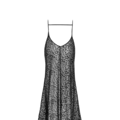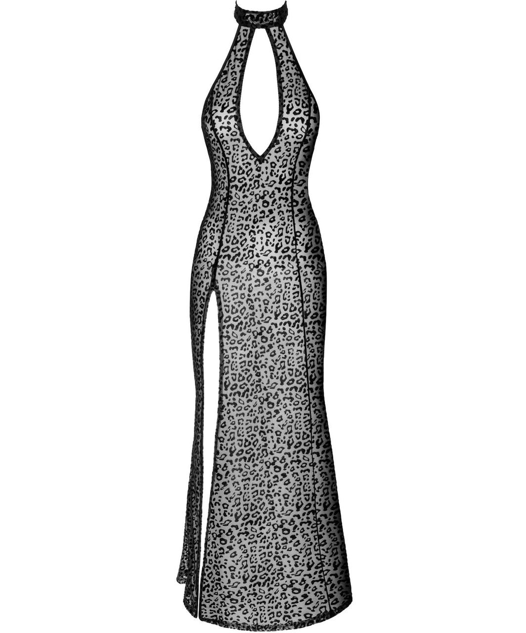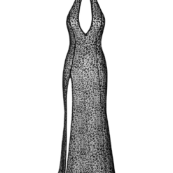 Sleeveless open back maxi dress made of soft sheer mesh with flock print in a leopard spot pattern and long slit up the front. High collar with hook and eye closure. Without G-string.
