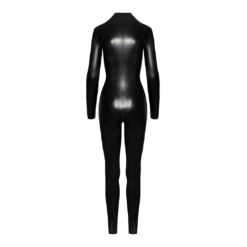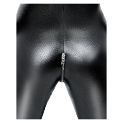 Black wet look snake skin pattern jumpsuit with full-length – from the collar to the crotch – two-way zipper with three sliders.