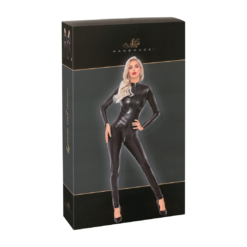 Black wet look snake skin pattern jumpsuit with full-length – from the collar to the crotch – two-way zipper with three sliders.