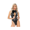 Black wet look jumpsuit with long sleeves, zipper in the back and over the crotch.