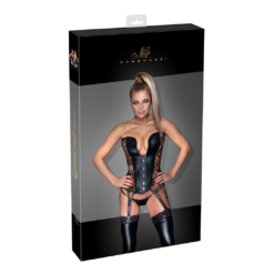 Figure emphasising corsage in a seductive design! Black corsage that has lace inserts at either side and 6 suspender straps. There is hook fastener at the front and sexy lacing at the back (not suitable for waist reduction). With a removable shoulder straps (not shown on picture). Very stretchy wetlook 80% polyamide, 20% elastane. Without string & stockings.