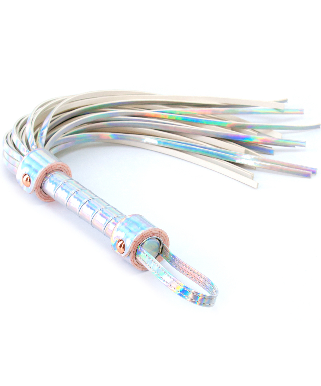Pakļaušanas piederumu komplekts – izsmalcinātā Cosmo Bondage kolekcija, kas ietver sešus BDSM aksesuārus no spīdīga vinila ar hologrāfisku virsu un metāla detaļām rozā zelta krāsā: