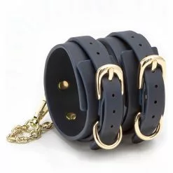 Navy blue leatherette ankle cuffs with gold-coloured buckles and chain with snap hooks – a part of exquisite Bondage Couture Collection. The buckle fasteners are adjustable.