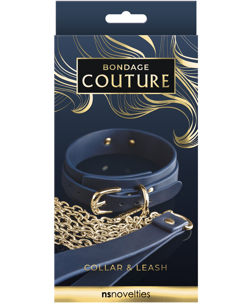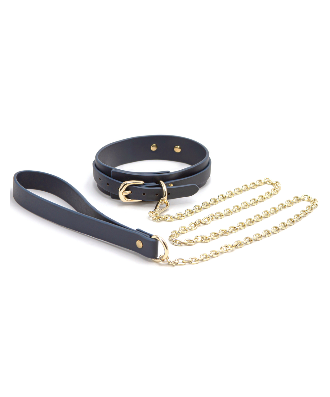 Navy blue leatherette collar with a gold-coloured chain leash – a part of exquisite Bondage Couture Collection. The buckle fastener is adjustable.