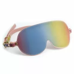 Krāsains, mazliet spīdīgs, mākslīgās ādas acu apsējs ar zeltainām, metāla kniedēm un siksnas sprādzi – daļa no Spectra Bondage izlases, kas ietver dažādus dažādus piederumus gaumīgām BDSM rotaļām un fotosesijām.