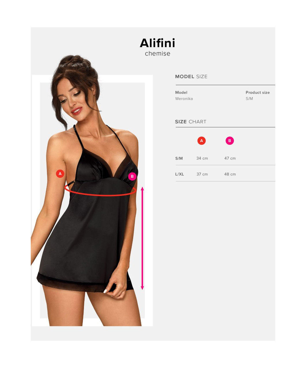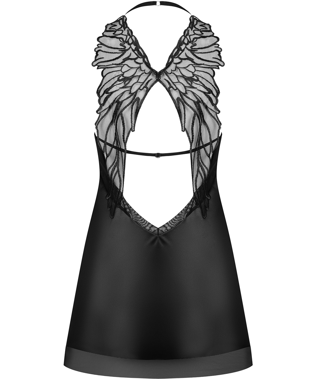 Black chemise with soft cups made of gathered opaque satin. Open back is adorned with lovely wing motif. Adjustable halterneck.