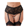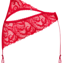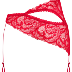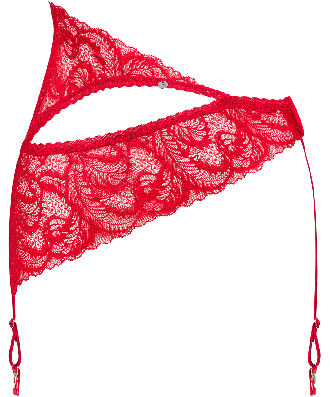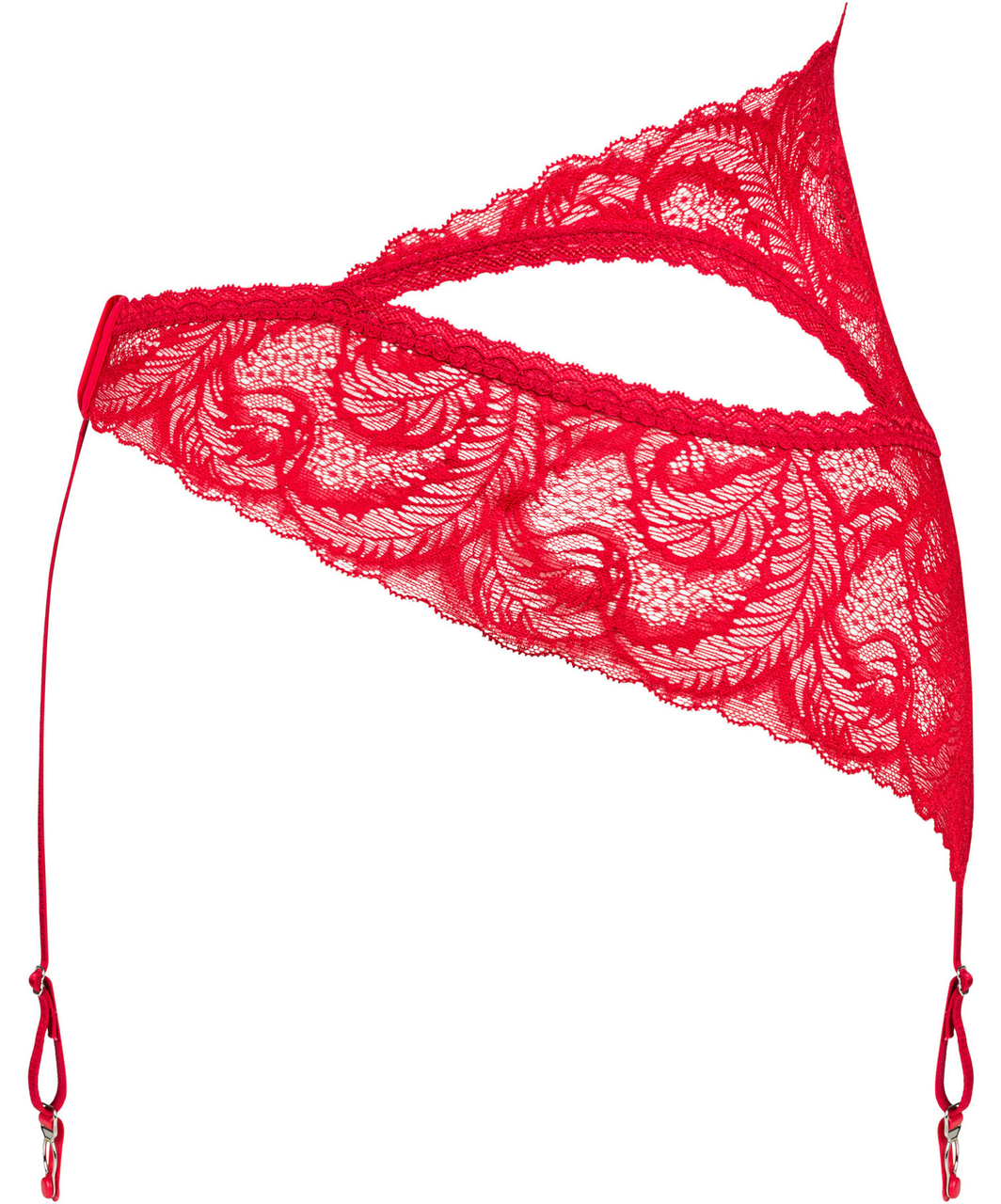 Red, asymmetric lace garter with four adjustable straps. There are seductive cut-outs on the front and back, while the side features a three-row hook closure and the front is embellished with a silver-colored decorative element.