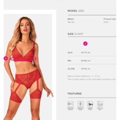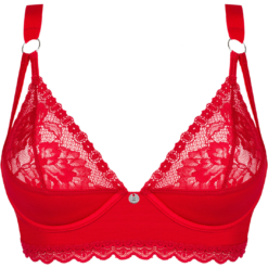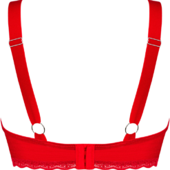 Red floral lace bra with supportive underwire and slight padding. The bra has a three-row hook closure on the back, the length of the straps can be easily changed; the front side of the bra is decorated with a silver-colored pendant.
