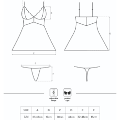 Black satin babydoll with floral lace top and pudded cups. Adjustable straps. Matching G-string included.