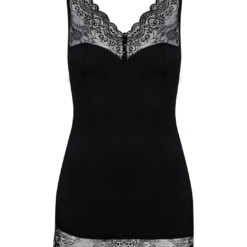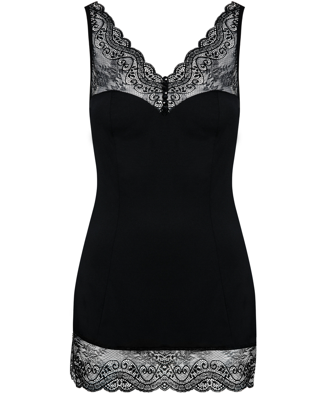 Charming black V-neck chemise made of soft lightweight fabric with delicate lace, sexy slit on hip, adorned with black rhinestones. Straps are adjustable. Matching G-string included.