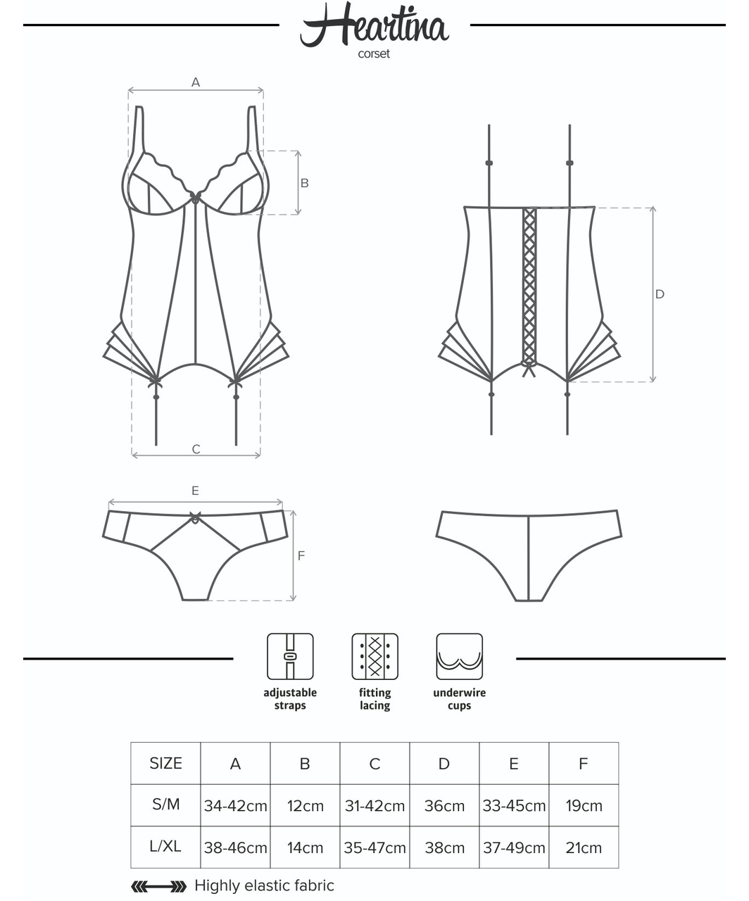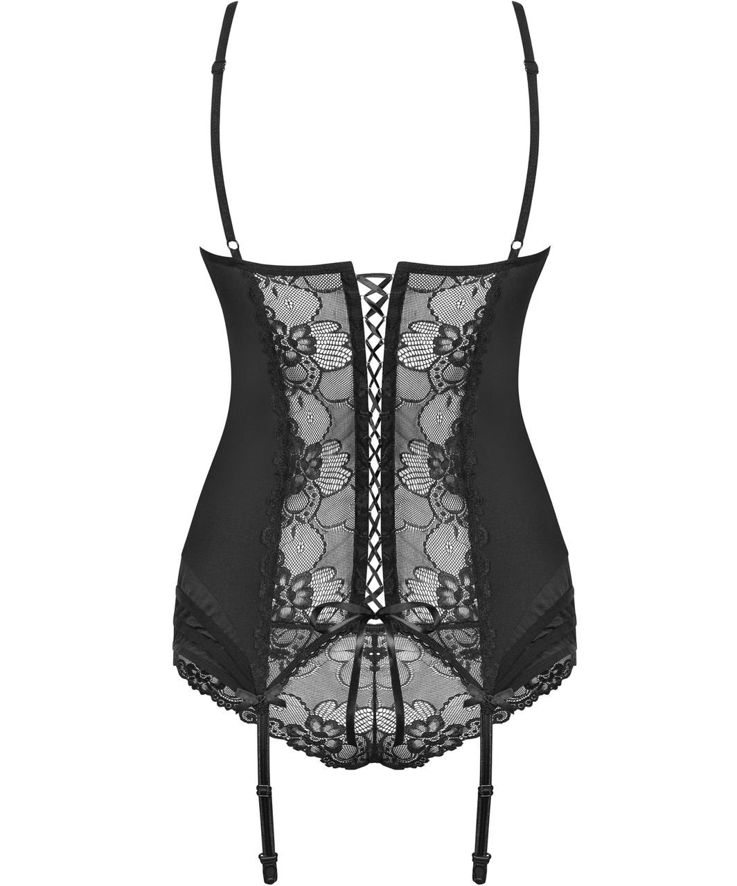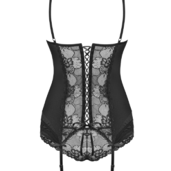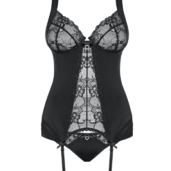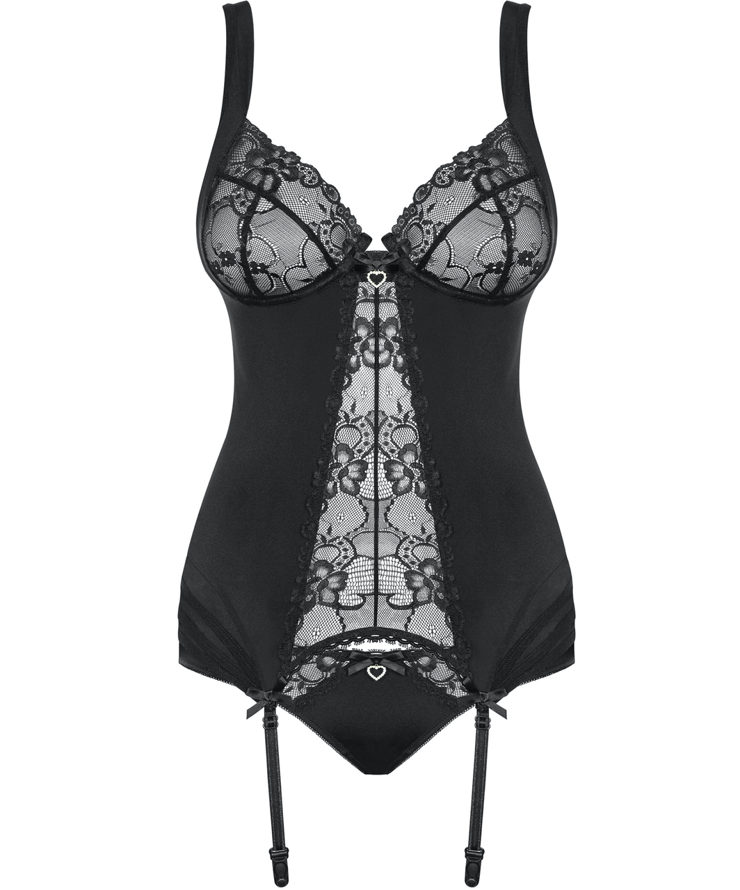 Splendid black basque with delicate floral lace inserts, underwire see-through cups, decorative lacing on the back and decorative stitching at either side. Matching panty included. Both adorned with bows and shiny heart-shaped pendants. Straps and garters are adjustable. Without stockings.