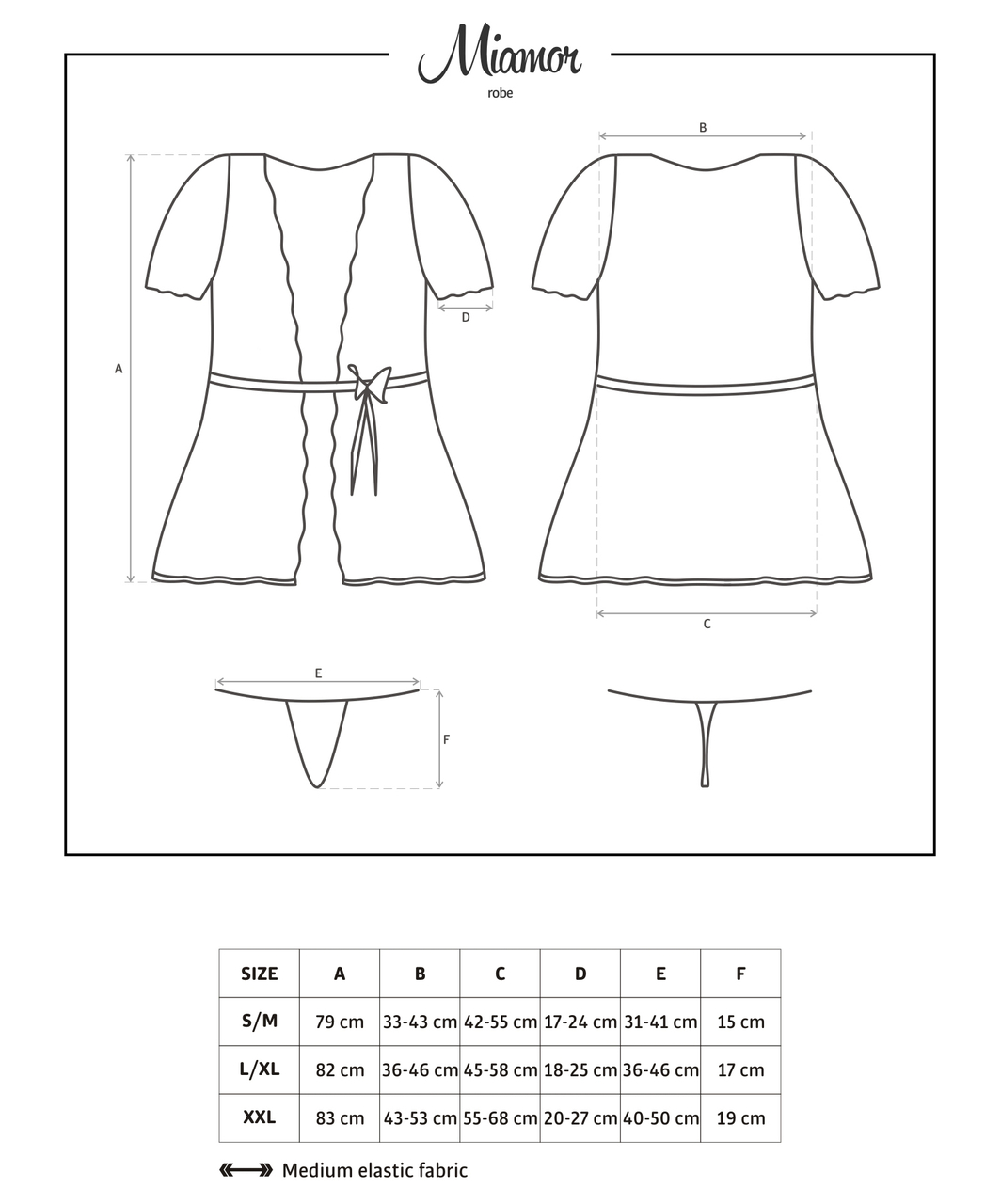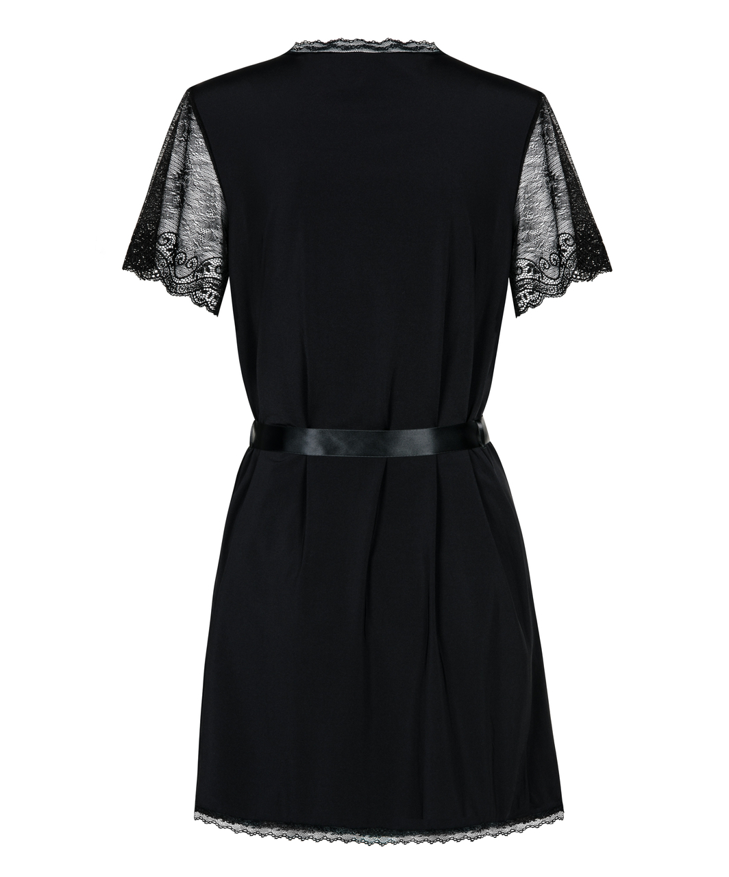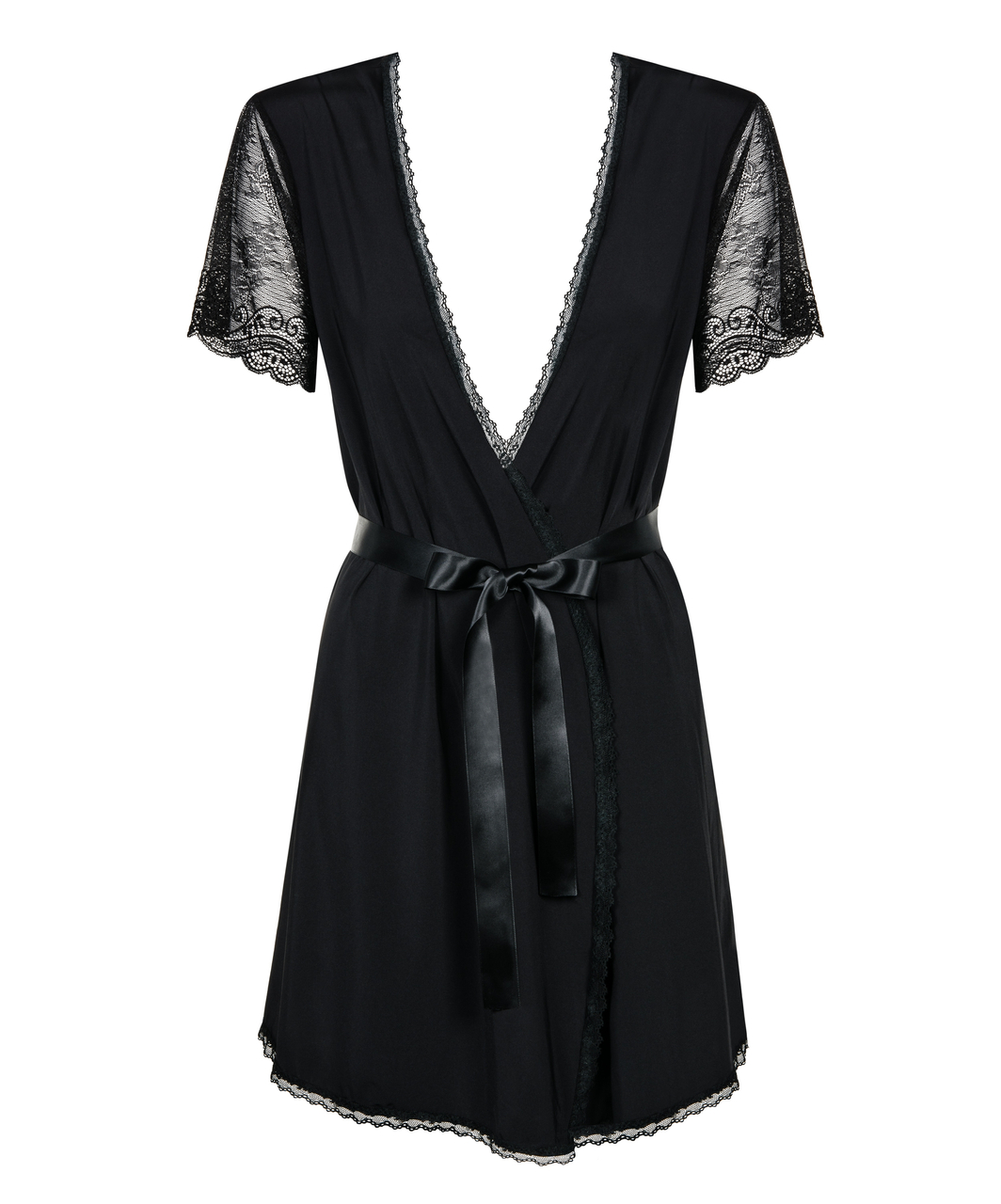 Black peignoir with satin sash and matching G-string. Short lacy sleeves and lace trimming.