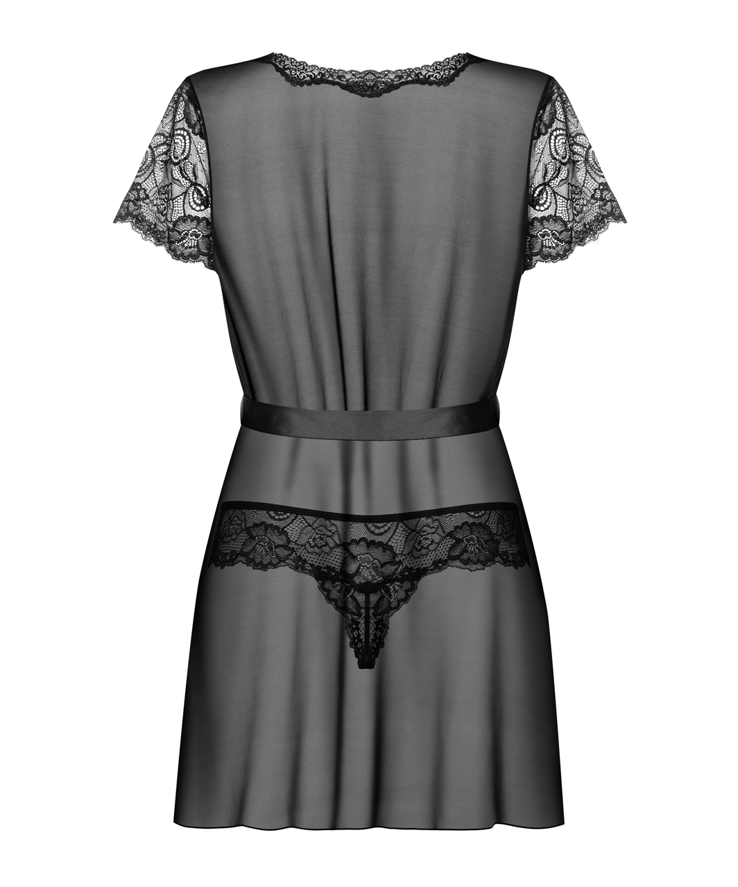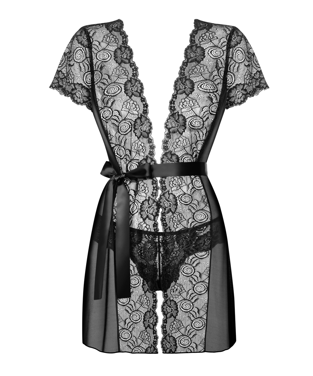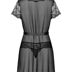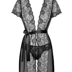 Black elastic powernet peignoir with lace inserts in the front and short lacy sleeves. Complete with sash and matching lacy thong.