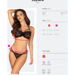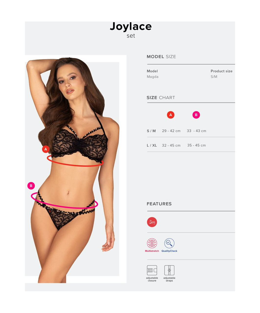 Black lace lingerie set which consists of soft halterneck bra with adjustable hook closure and matching G-string. Both garments adorned with white pearls.