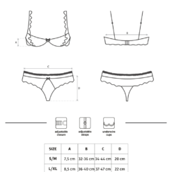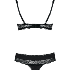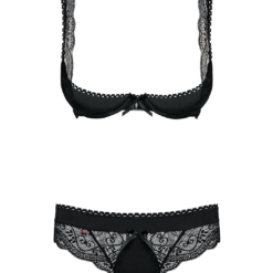 Seductive two-piece lingerie set made of opaque fabric and delicate lace. The set consists of a padded shelf bra with underwire cups, adjustable lacy straps and hook closure at the back. Completed with matching lacy panty. Both garments are adorned with a satin bows.