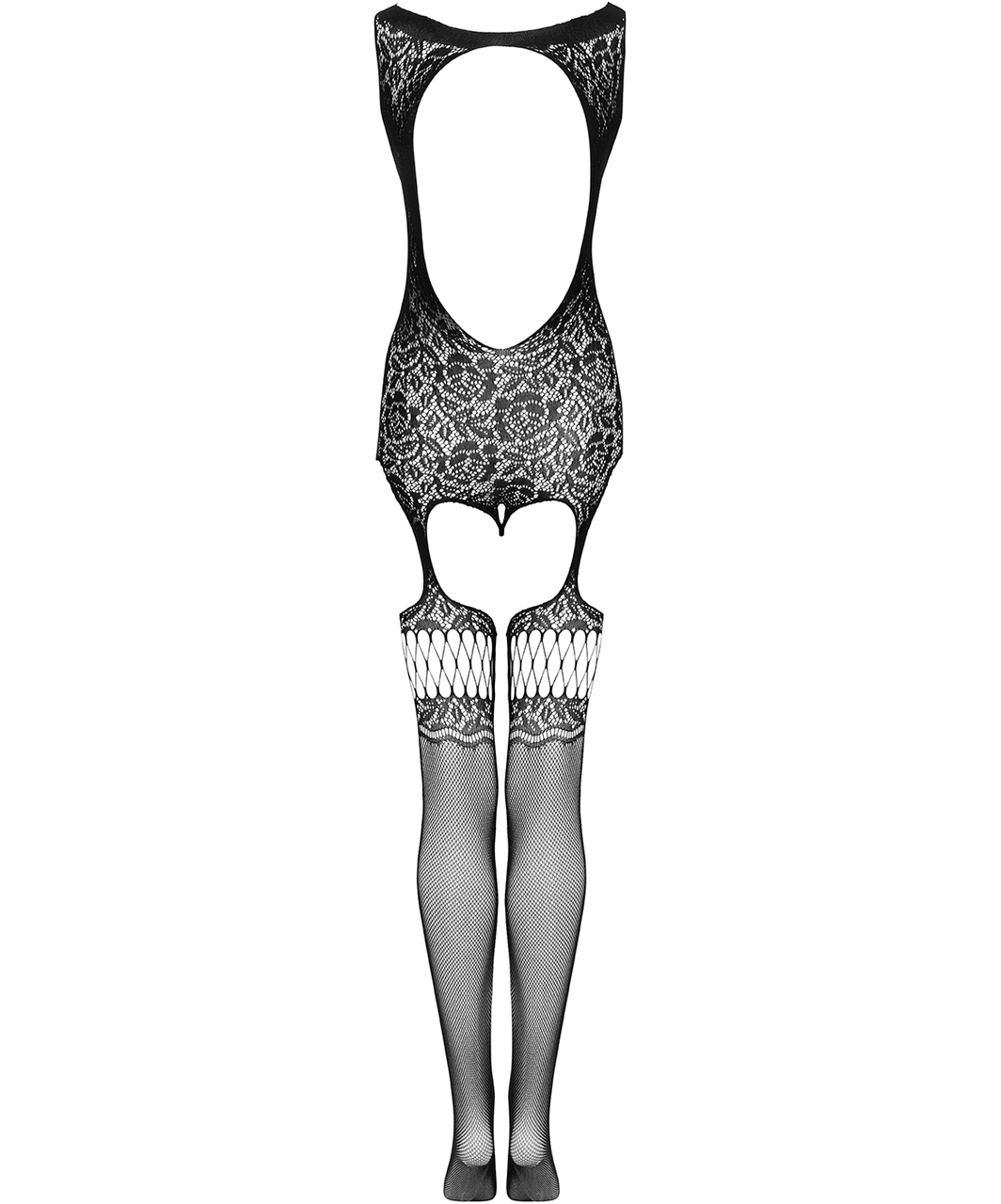 Black net crotchless bodystocking with cutouts and delicate pattern. Unisize (S–L).
