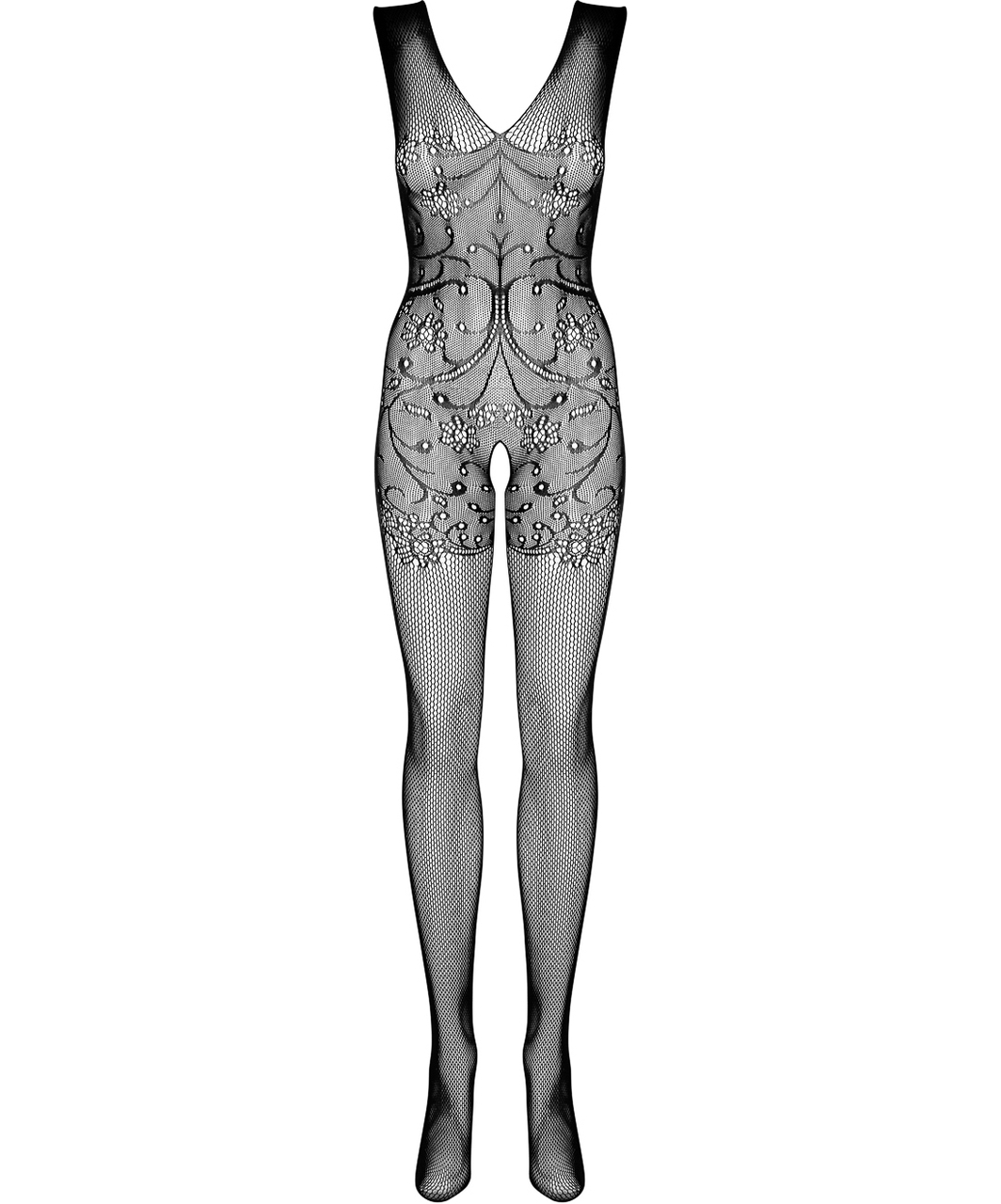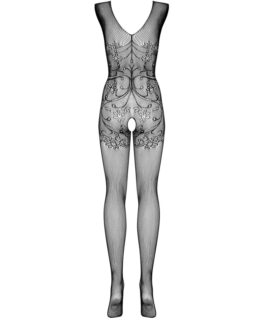 Black net crotchless bodystocking with delicate pattern. Unisize (S–L).