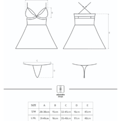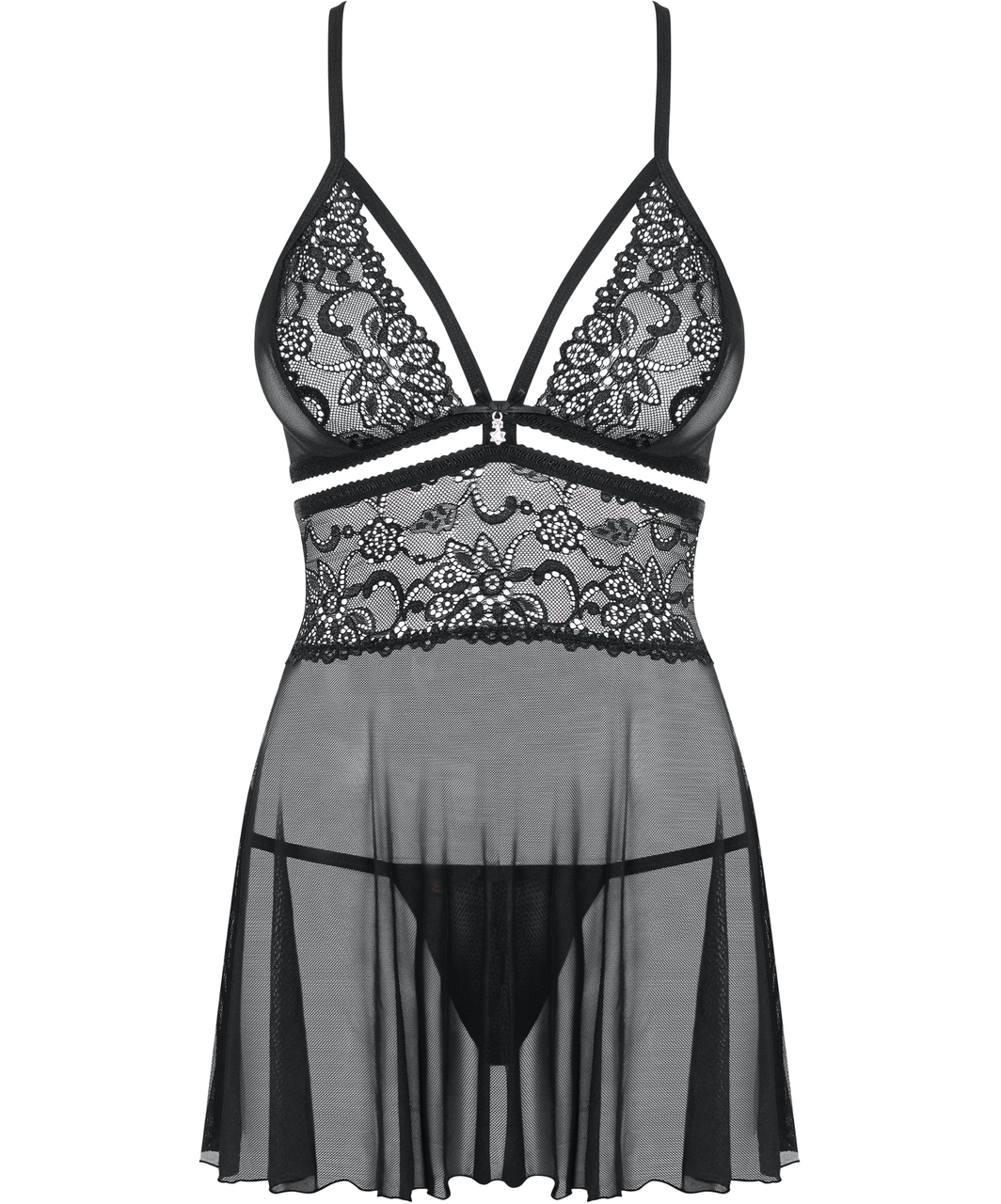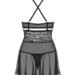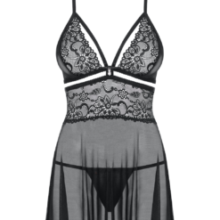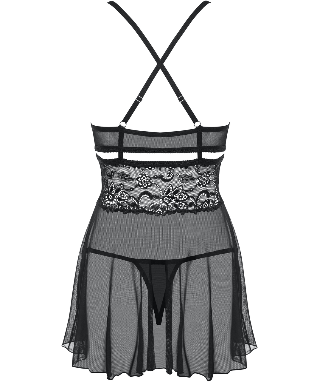 Charming and sexy babydoll made of sheer mesh with floral pattern lace in black color, adorned with coquettish bow and beautiful silver-colored pendant with shiny rhinestones. Straps are adjustable. Matching G-string included.