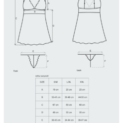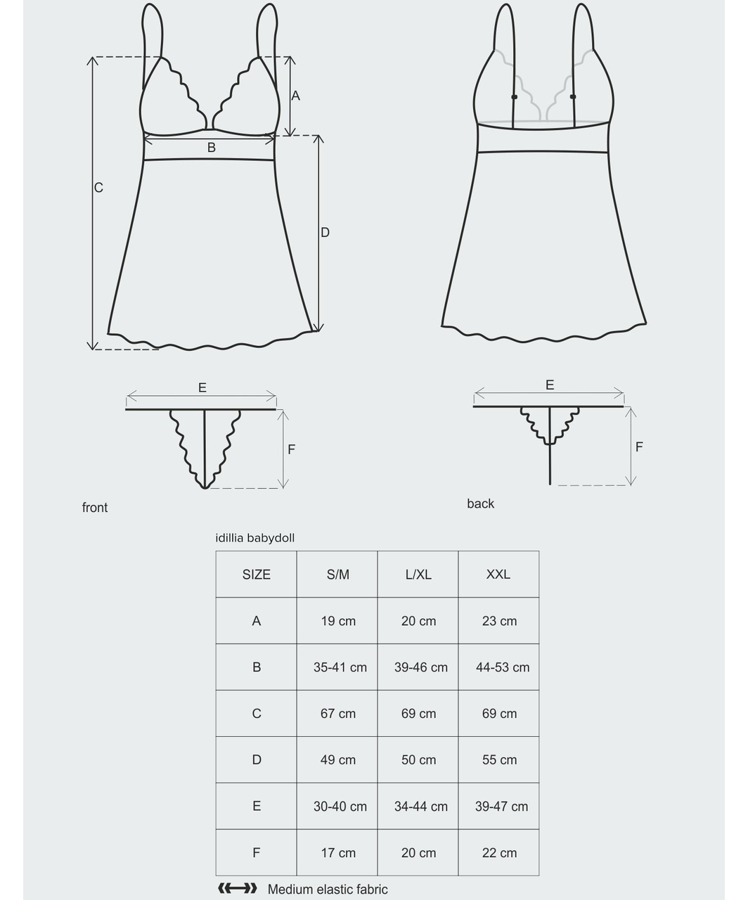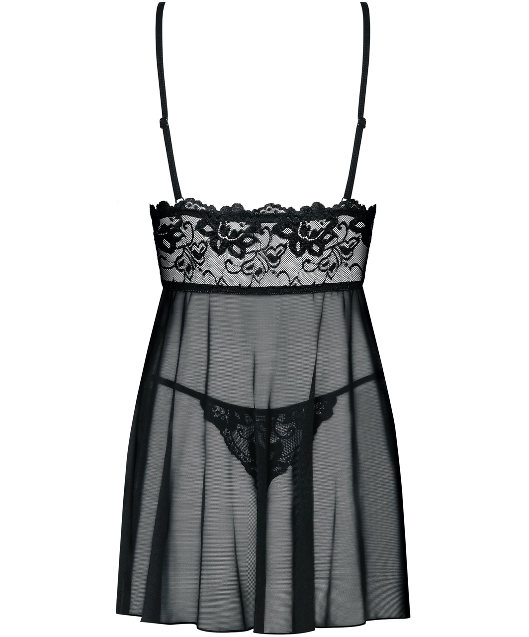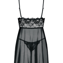 Black mesh babydoll with lace top. The length of the straps is adjustable. Comes with lace thong.