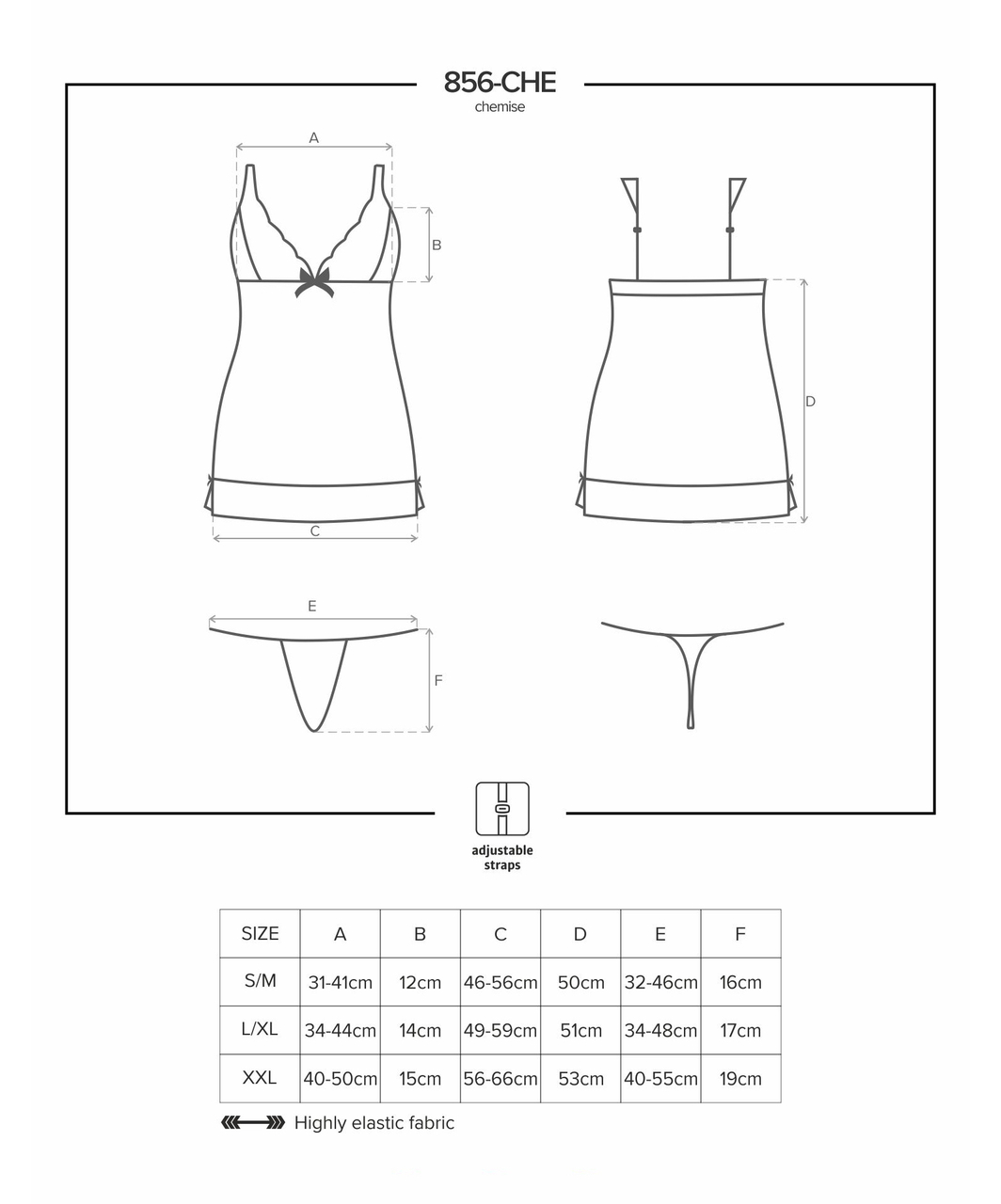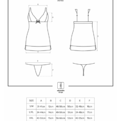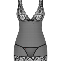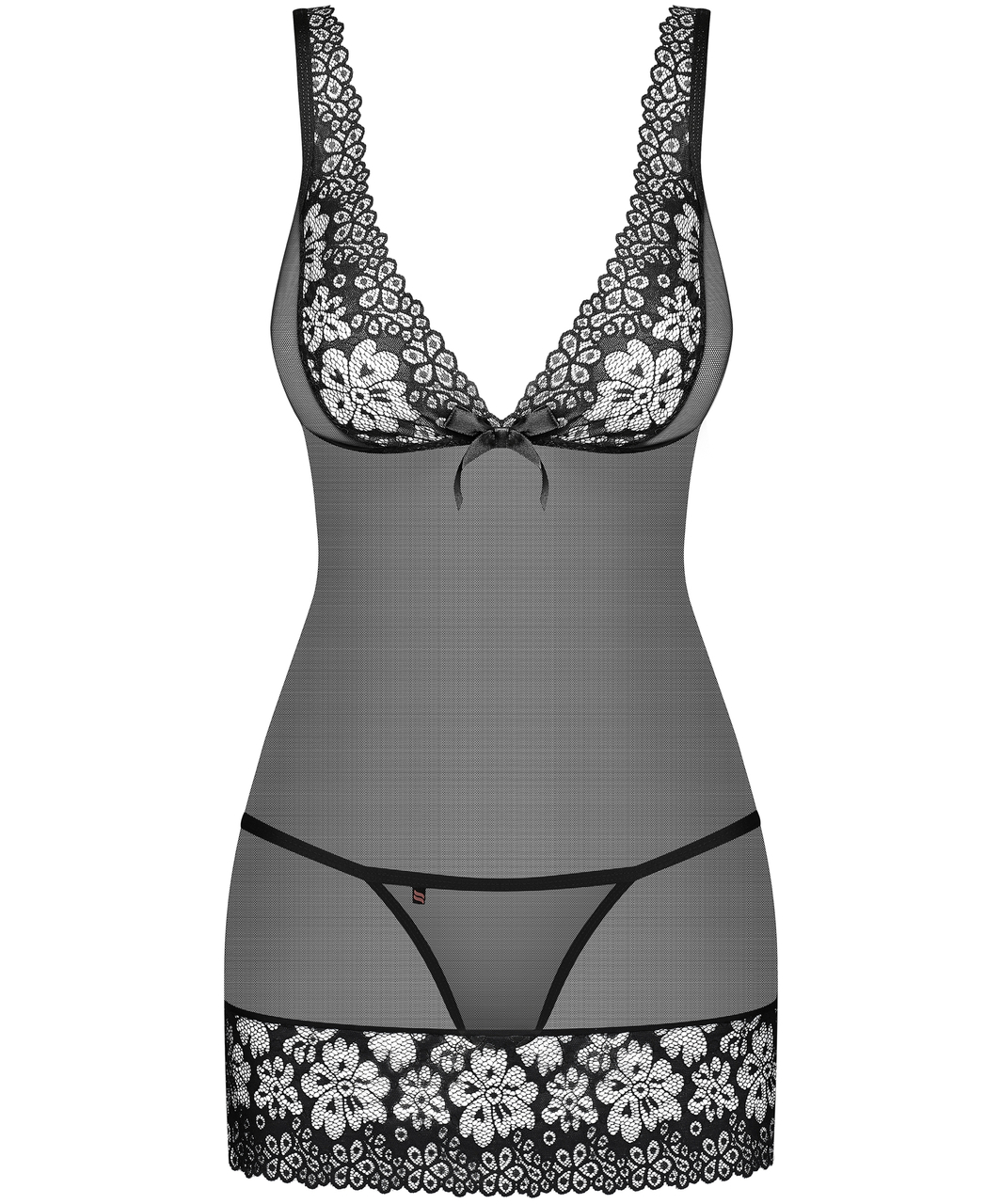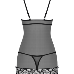 Black see-through mesh chemise in subtle, feminine style adorned with charming floral pattern lace and satin bows. Matching G-string included. Straps are adjustable.