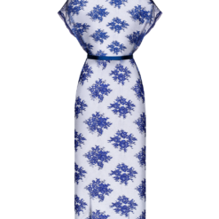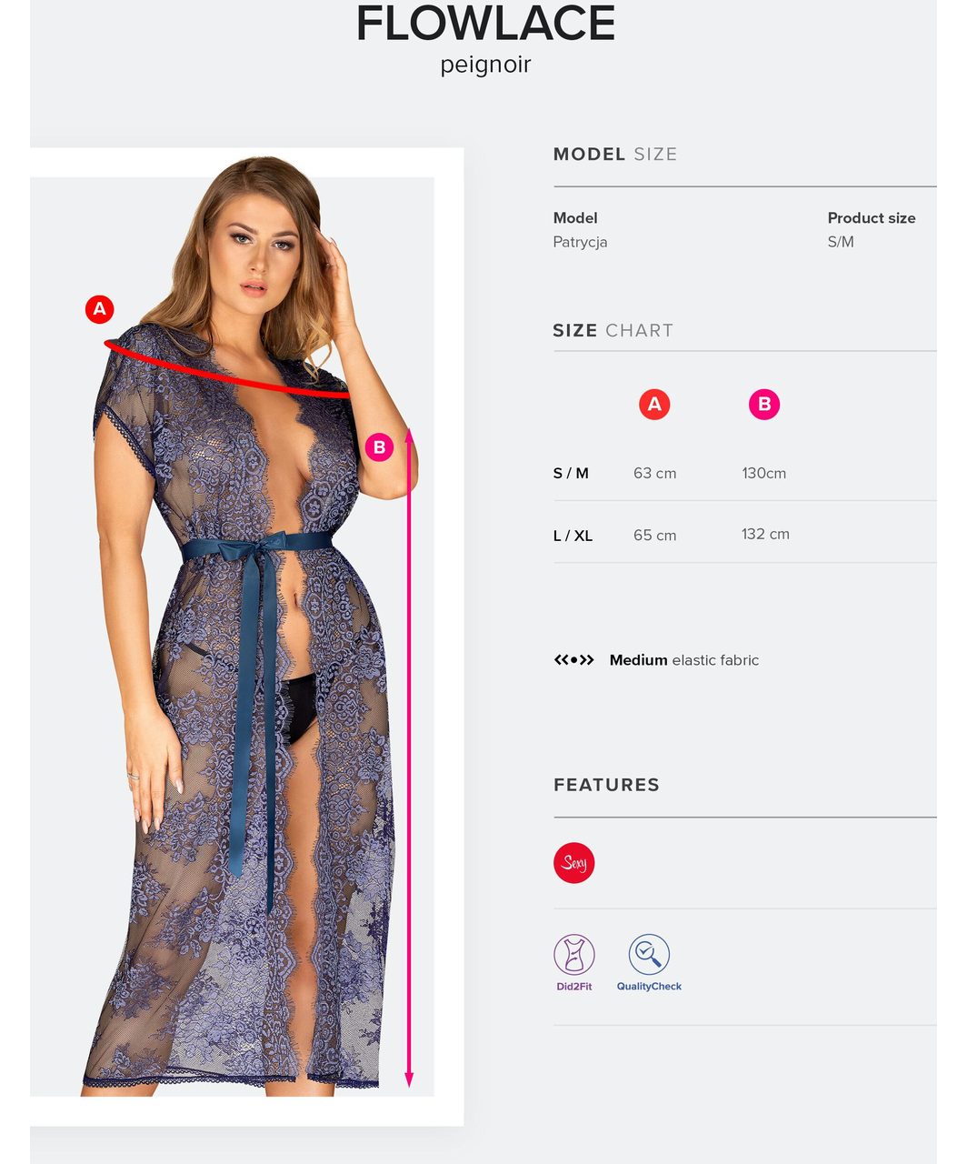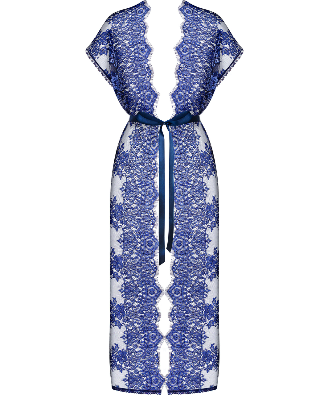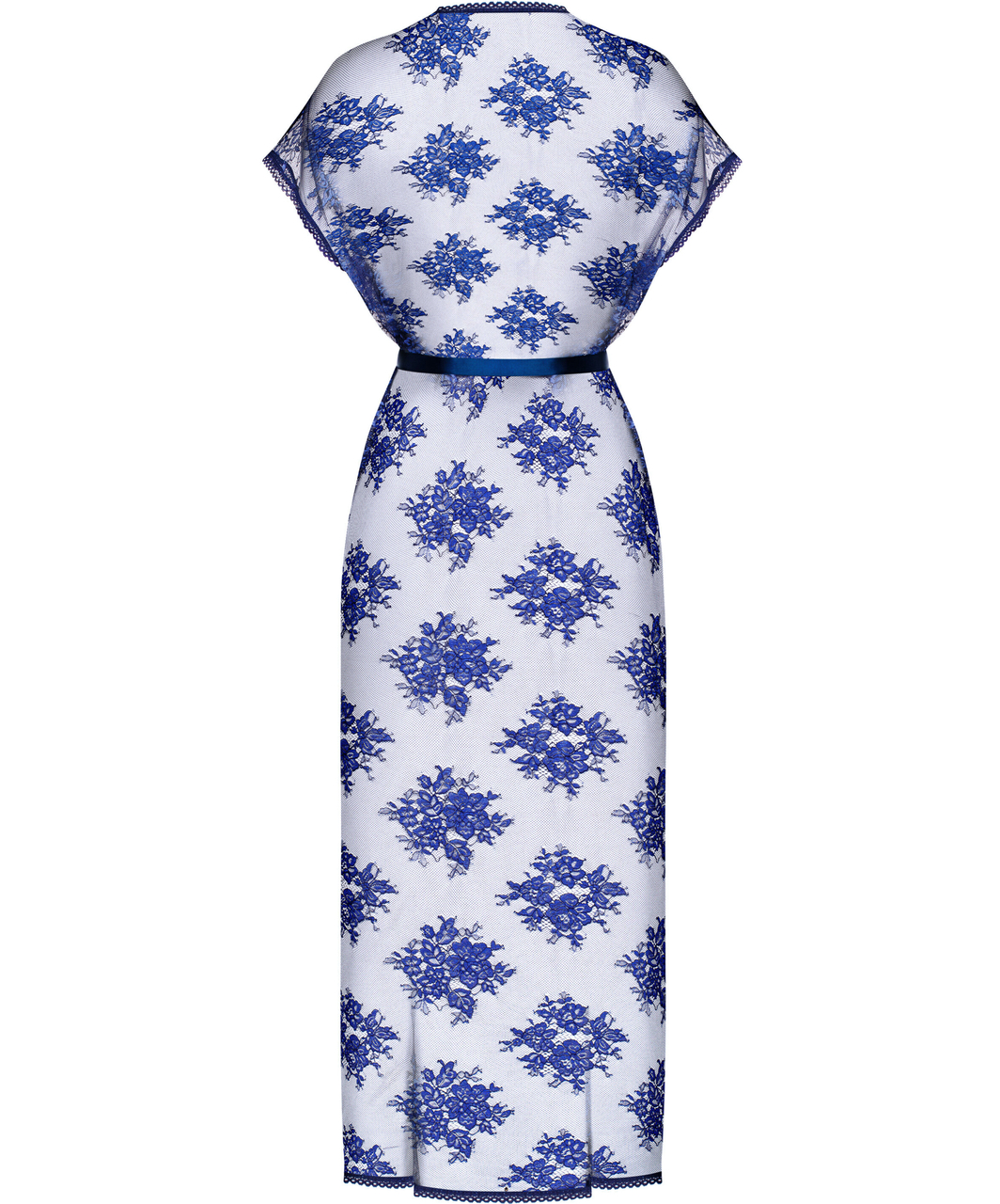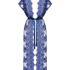 Charming sheer peignoir made of soft lightweight lace in a vivid blue color. Fastening with satins sash.