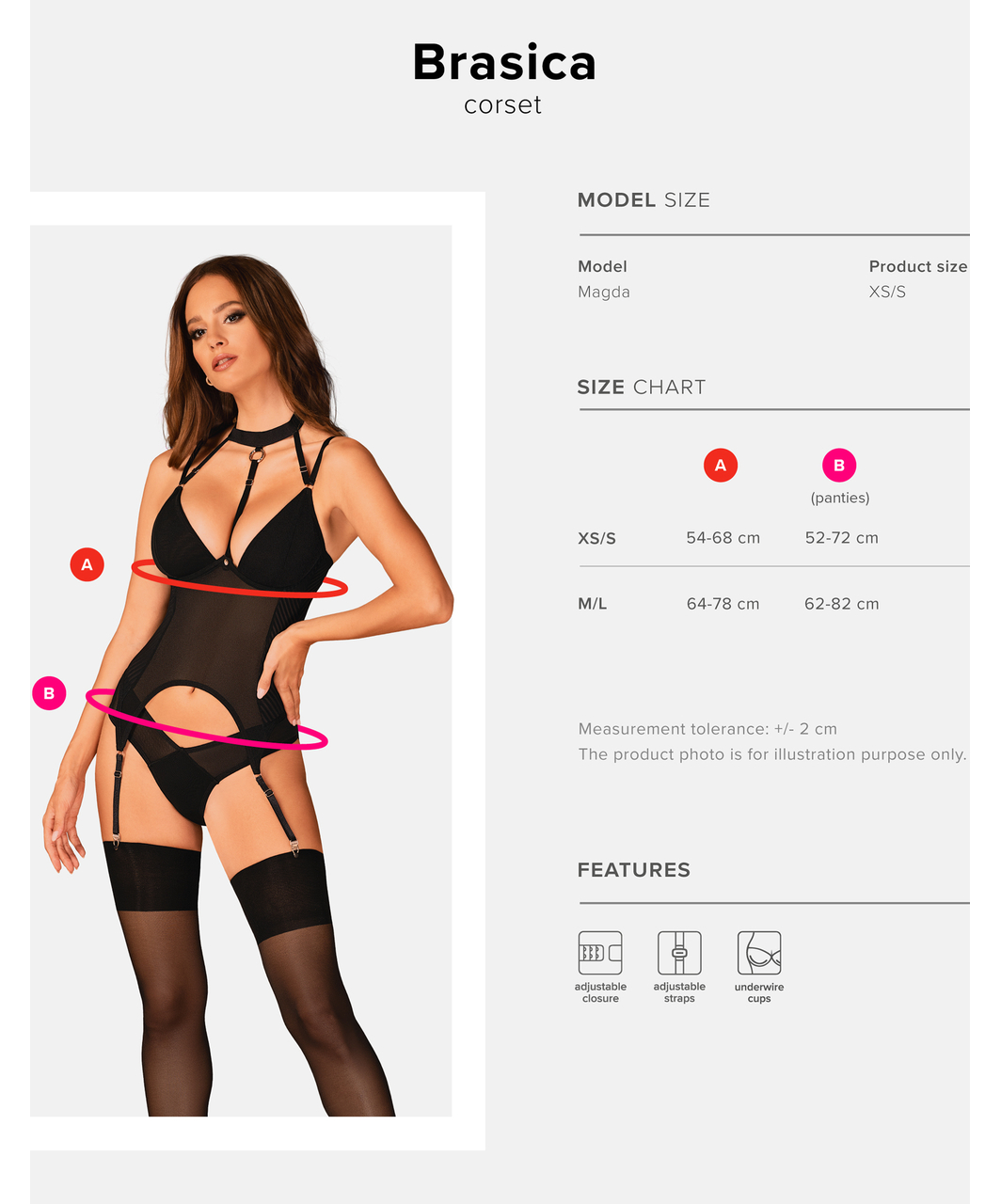 Elegant, black basque with underwired cups and sheer mesh inserts. There’s a decorative elastic choker which is connected to the bra with 3 elastic straps and fastens in the back with a decorative gold chain. The middle strap with a gold ring is easily removable. The length of straps and suspenders can be easily changed; hook-and-loop closure on the back. Complete with matching panties.
